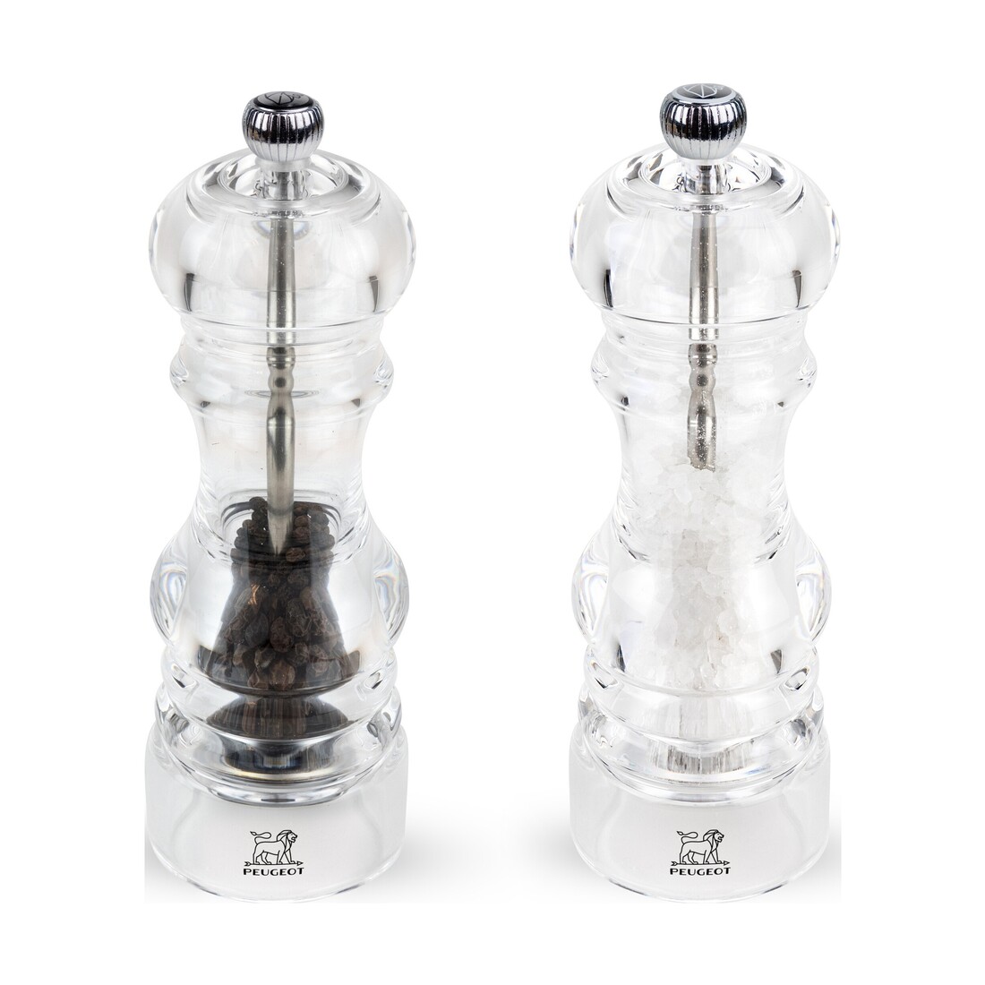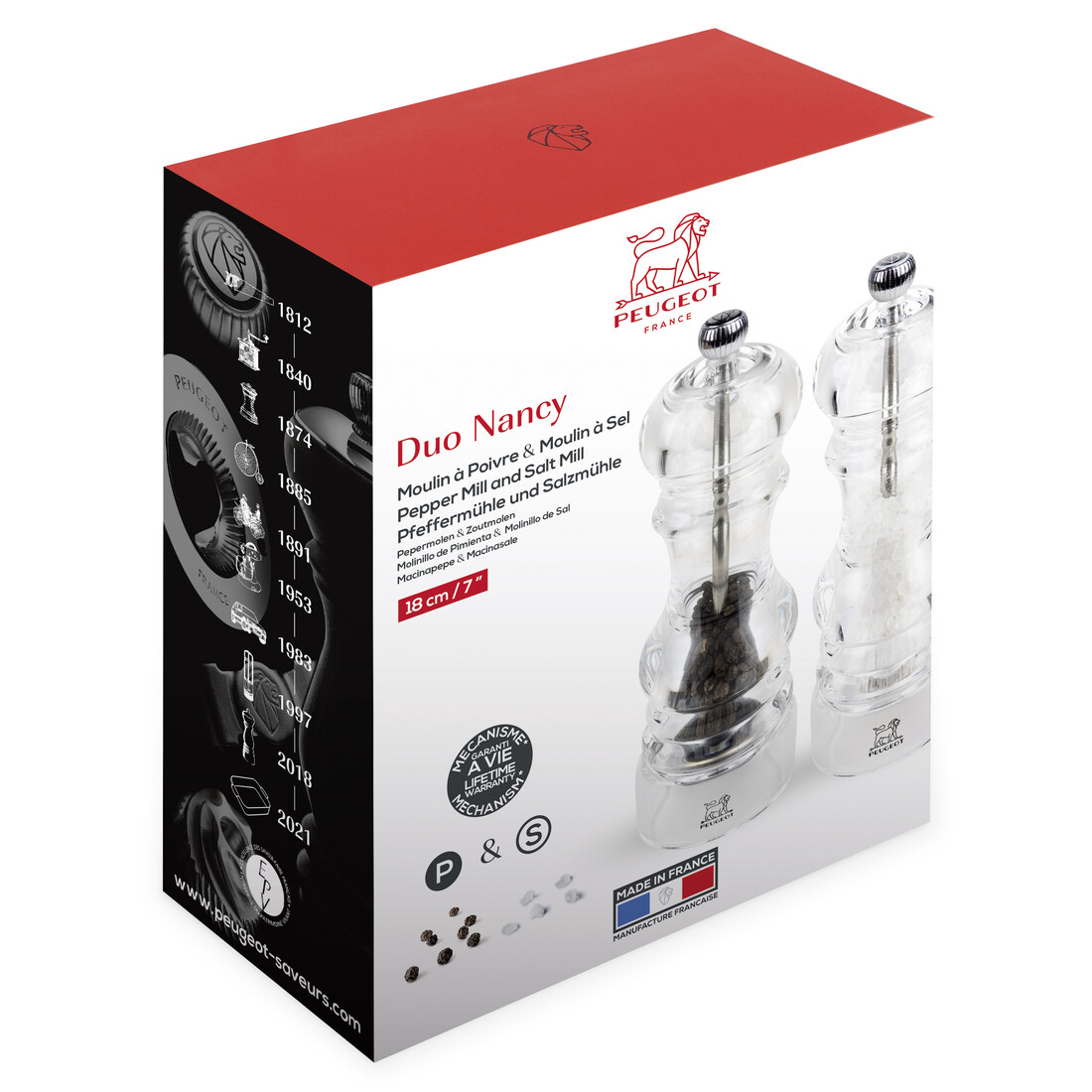 De Peugeot Nancy peper- en zoutmolen zijn stijlvolle smaakmakers. Gemaakt van transparant acryl en met een afmeting van 18 cm. Dit compacte duo is een onmisbare set tijdens ieder etentje of in de keuken.
