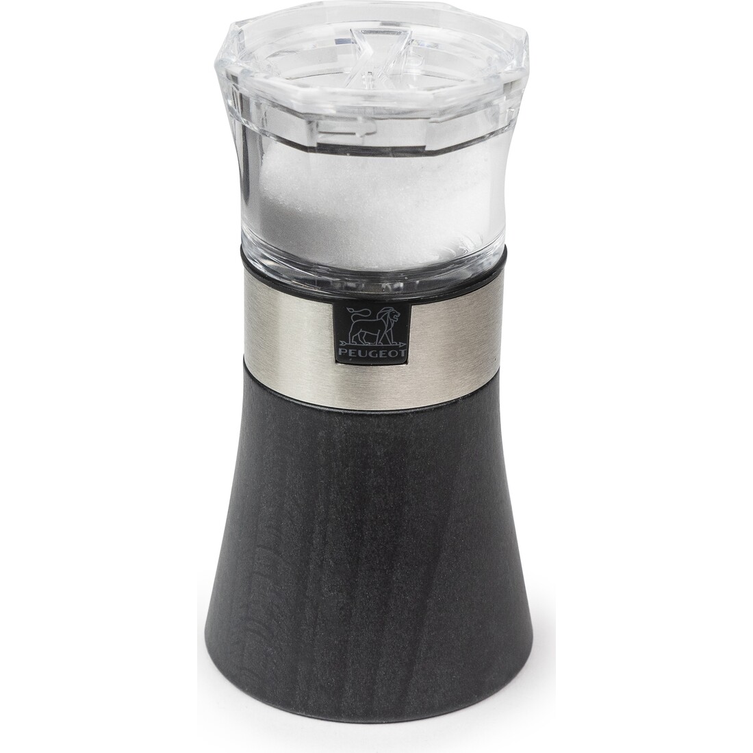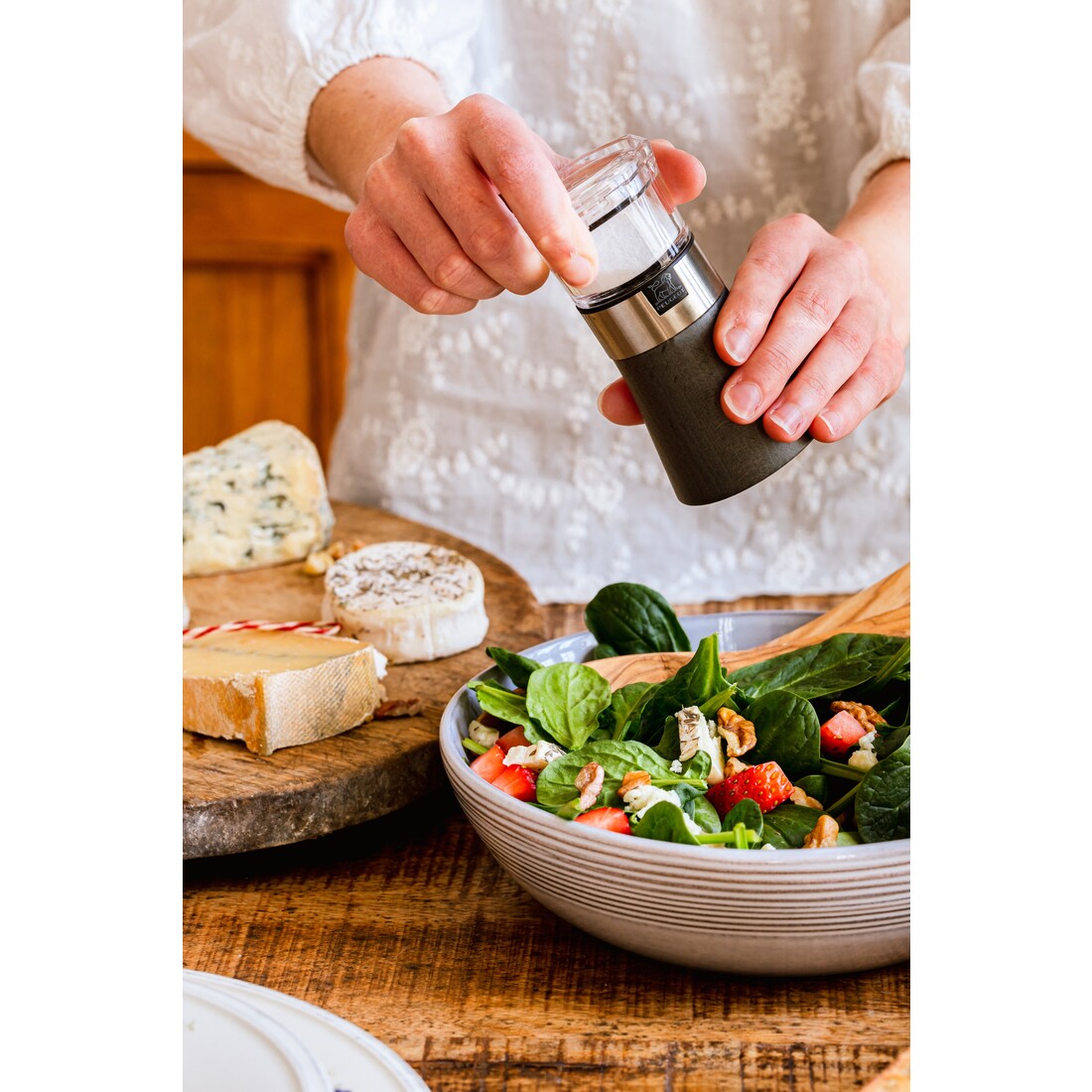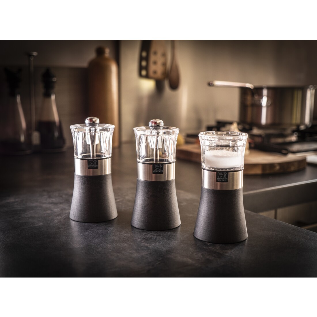 Met de Peugeot Oslo pepermolen met zoutvaatje kies je voor een unieke combinatie van smaak en materialen. De body van de kruidenmolen is gemaakt van beukenhout in de kleur grafiet. De bovenkant, het zoutvaatje, is gemaakt van transparant acryl. De body is voorzien van inox details en dat geeft de molen een moderne uitstraling. De compacte kruidenmolen heeft een afmeting van 11 cm.