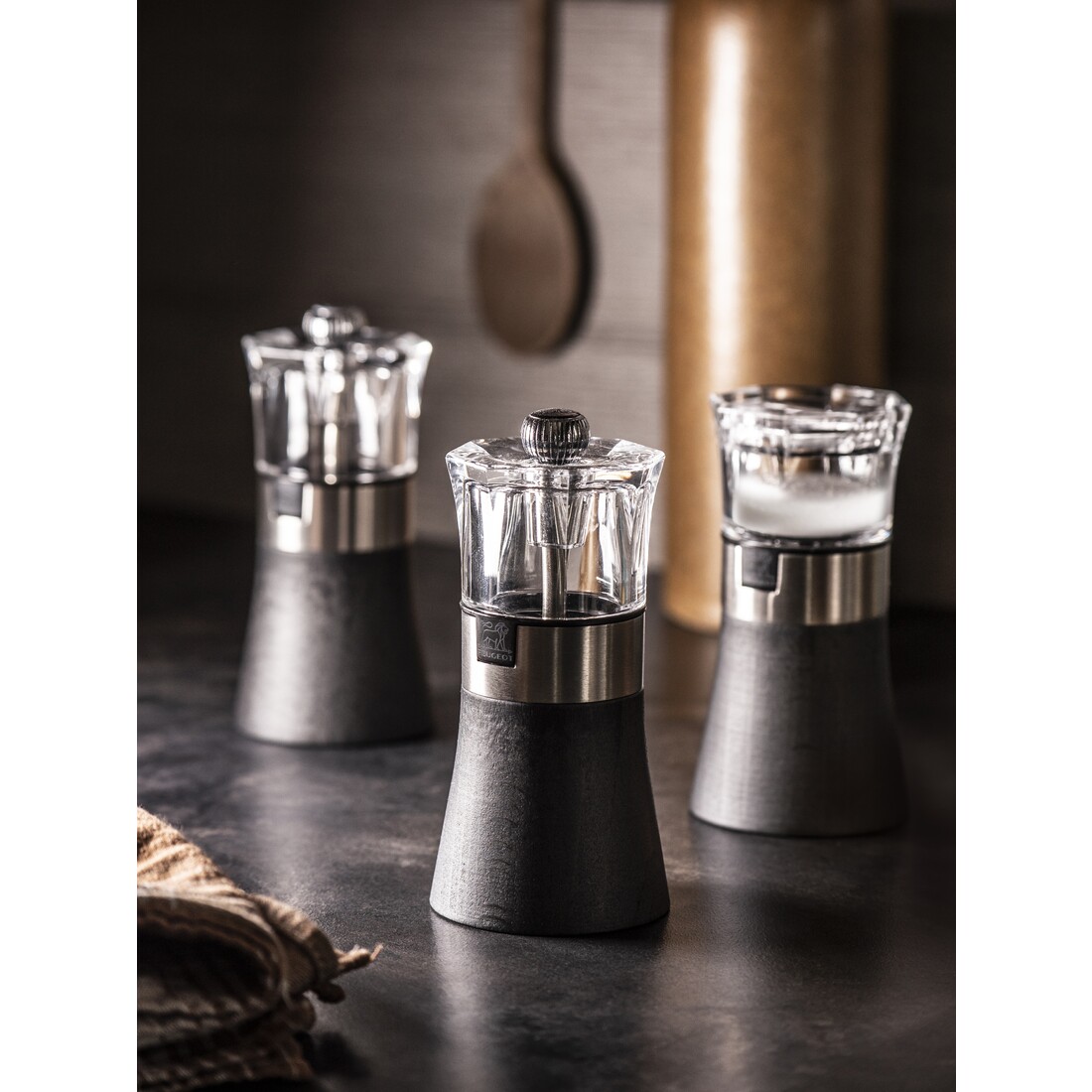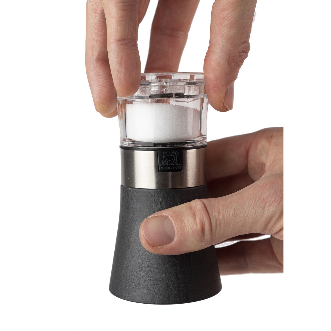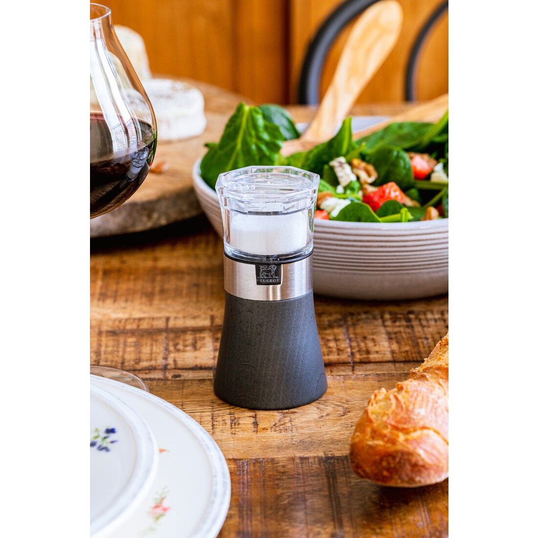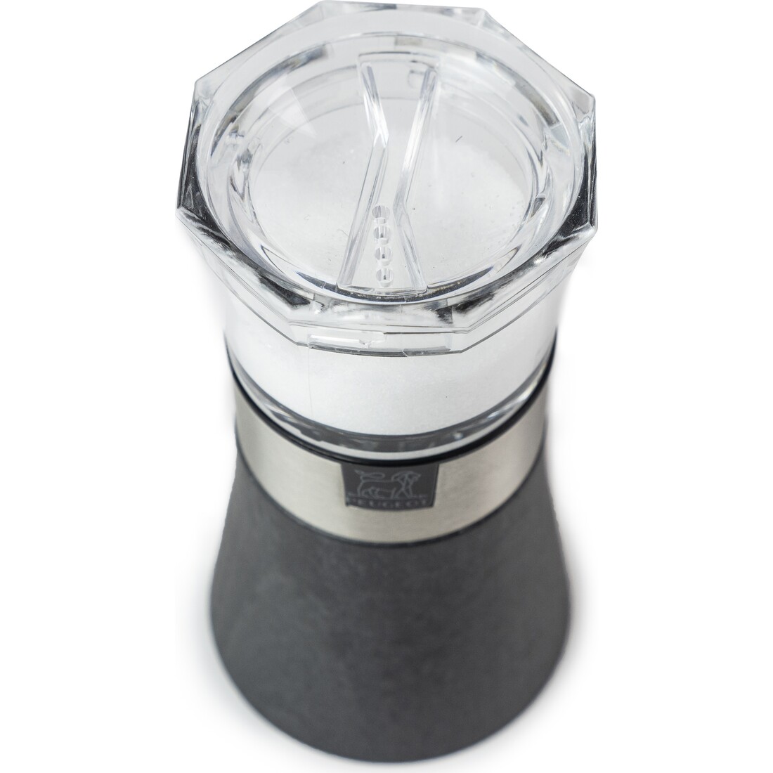 Met de Peugeot Oslo pepermolen met zoutvaatje kies je voor een unieke combinatie van smaak en materialen. De body van de kruidenmolen is gemaakt van beukenhout in de kleur grafiet. De bovenkant, het zoutvaatje, is gemaakt van transparant acryl. De body is voorzien van inox details en dat geeft de molen een moderne uitstraling. De compacte kruidenmolen heeft een afmeting van 11 cm.