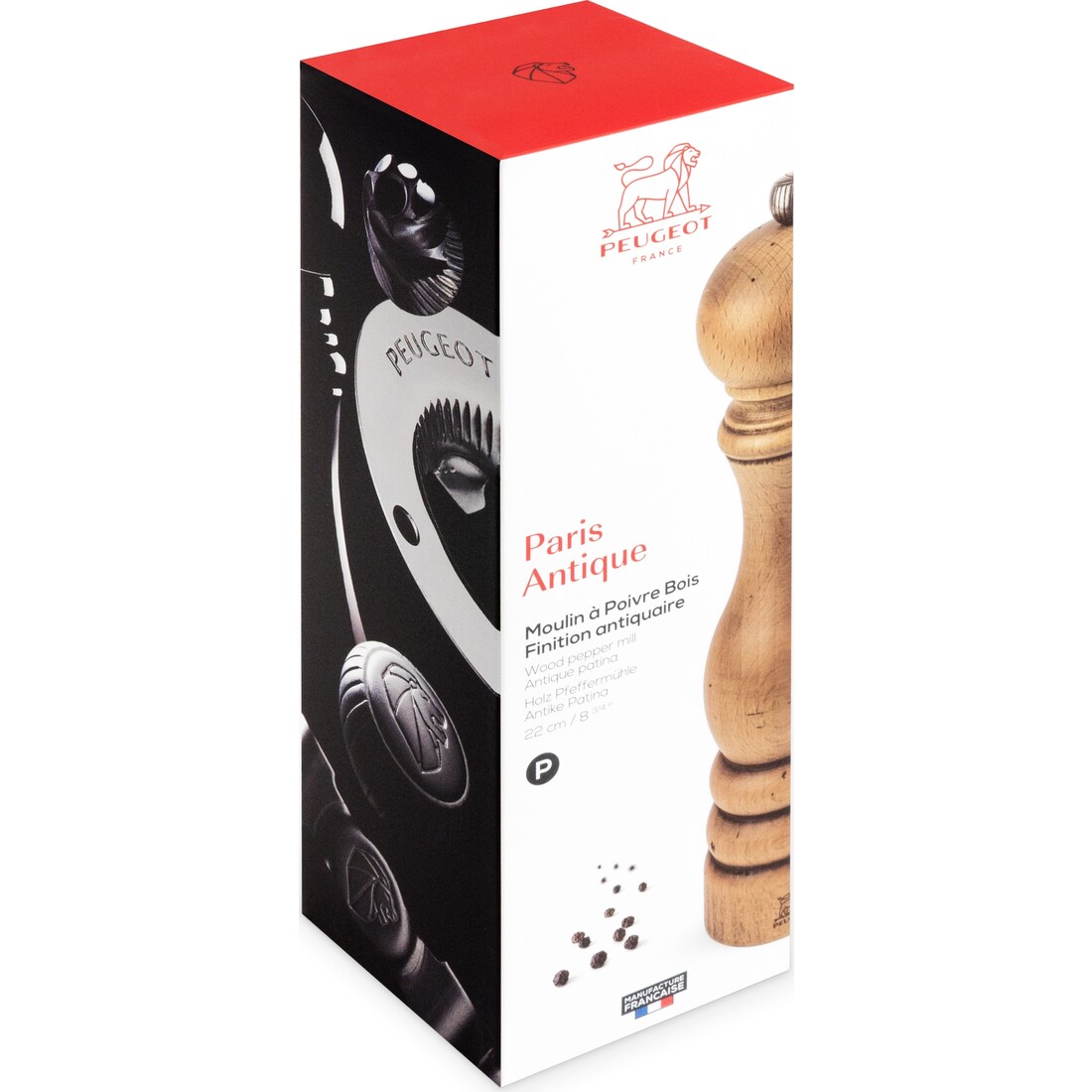 De klassieke Peugeot pepermolen, maar dan in een antiek jasje gestoken. Dat is de Peugeot Antique serie. Deze pepermolen is gemaakt van beukenhout met een antieke afwerking en is 22 cm hoog. De unieke uitstraling van deze molen maakt van iedere tafel een klassiek feestje.