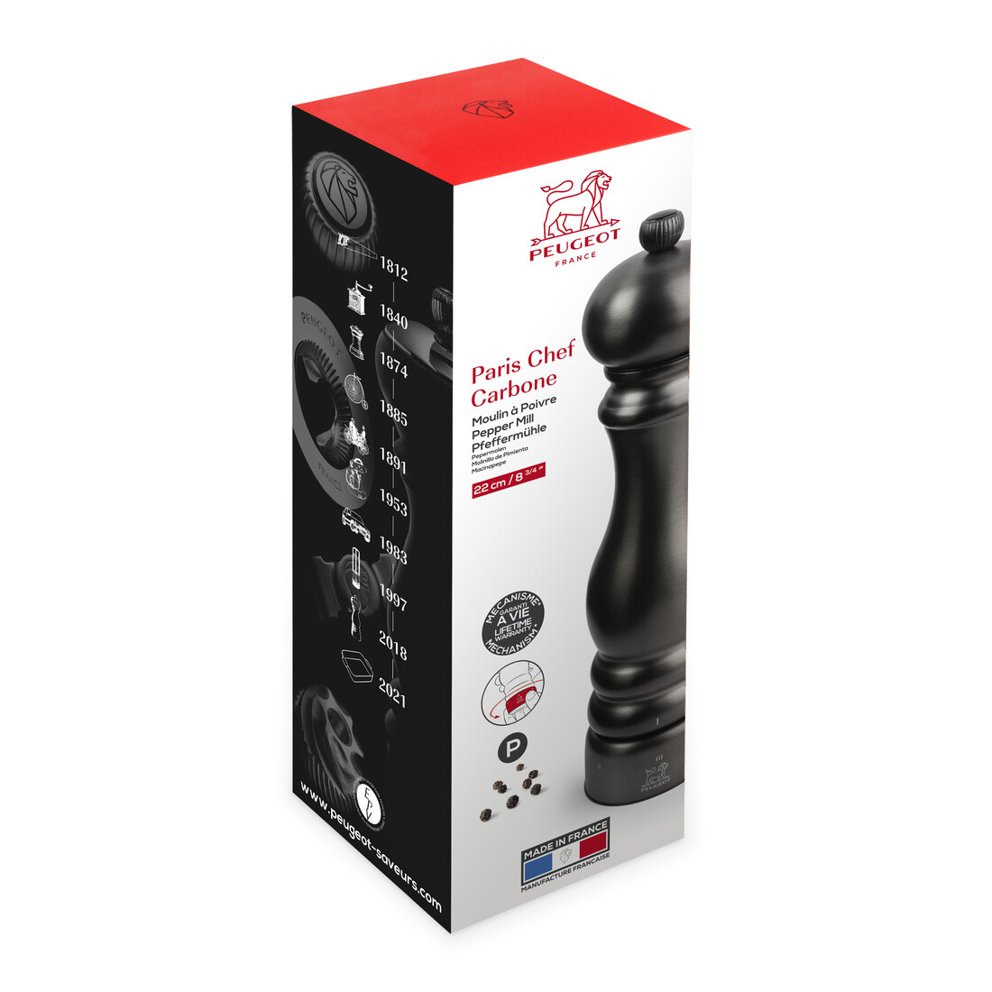De klassieke Peugeot pepermolen, maar dan in een ander jasje gestoken. Dat is de Peugeot Paris chef serie. Deze pepermolen heeft een carbonkleurige roestvrijstalen bekleding en is 22 cm hoog. De unieke uitstraling van deze molen maakt van iedere tafel een echt feestje. Maak gerechten op smaak en stel de maalgraad gemakkelijk in, met de vernieuwde u'Select functie. De molen heeft een maalwerk met dubbele tanden waardoor peperkorrels stevig vastgehouden worden, om ze vervolgens zo fijn als jij wilt te kunnen malen. Reinig na enige tijd de pepermolen aan de binnenkant met een vochtige doek om de levensduur van deze stijlvolle molen te onderhouden.