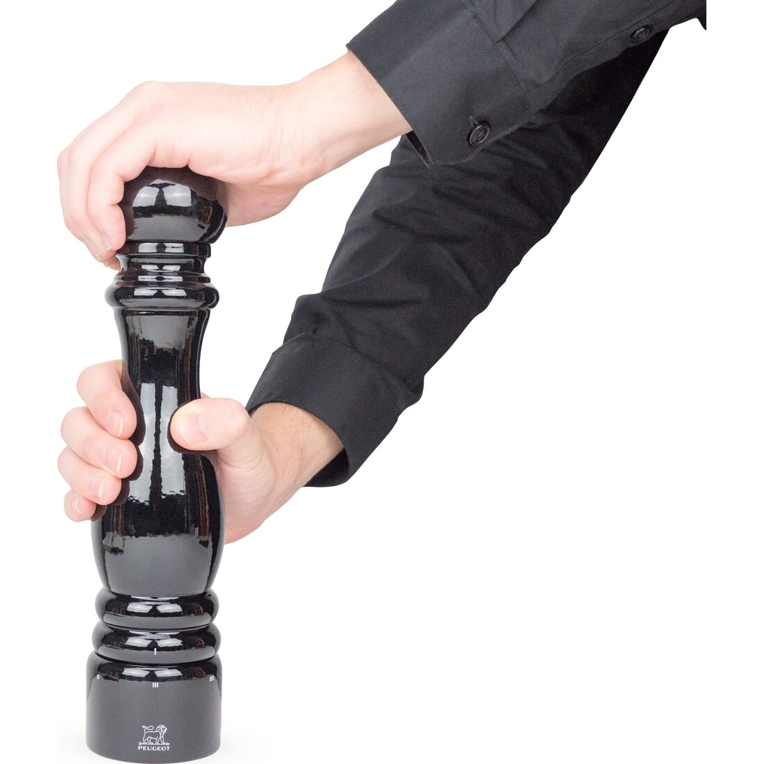 De Peugeot Paris u’Select pepermolen in een chique zwarte kleur is perfect voor iedere (hobby)kok. Met het u’Select-systeem stel je de maalgraad gemakkelijk en professioneel in, waardoor je altijd de perfecte smaak kiest voor jouw gerecht. Je stelt dit in door onderaan de molen te draaien. De slanke houten vorm ligt prettig in de hand en is daarom fijn in gebruik. De pepermolen heeft een afmeting van 30 cm en is stijlvol afgewerkt met een zilverkleurige knop met het kenmerkende logo van Peugeot daarop. Het is een veelzijdige molen voor gebruik in de keuken e´n op tafel.
