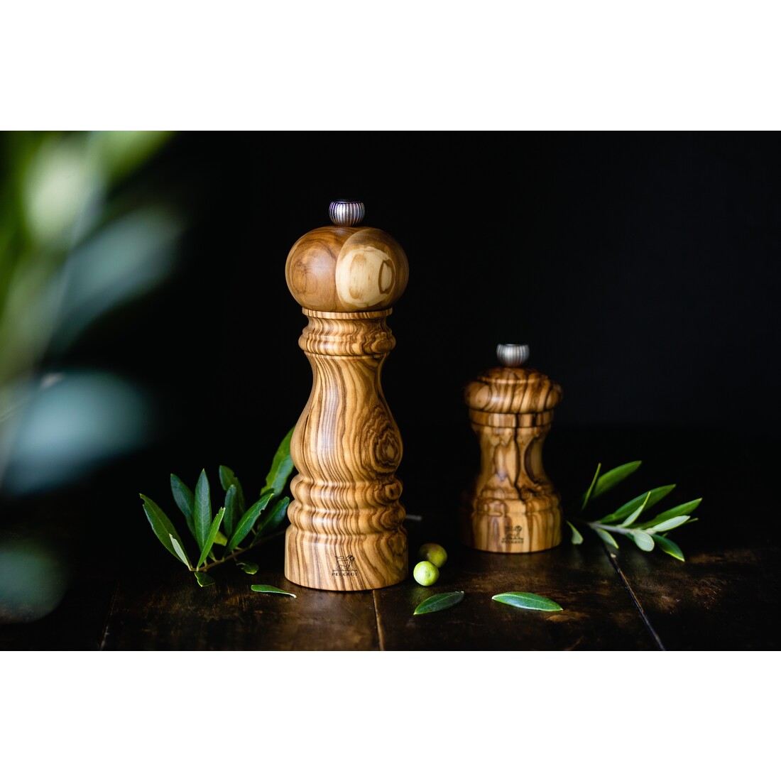 Eén van de favorieten van chefs over de hele wereld zijn de manuele Peugeot Paris zoutmolens. Deze molen heeft een afmeting van 18 cm en is gemaakt van olijfhout. De sierknop die zich bovenop de molen bevindt laat je de maalgraad instellen