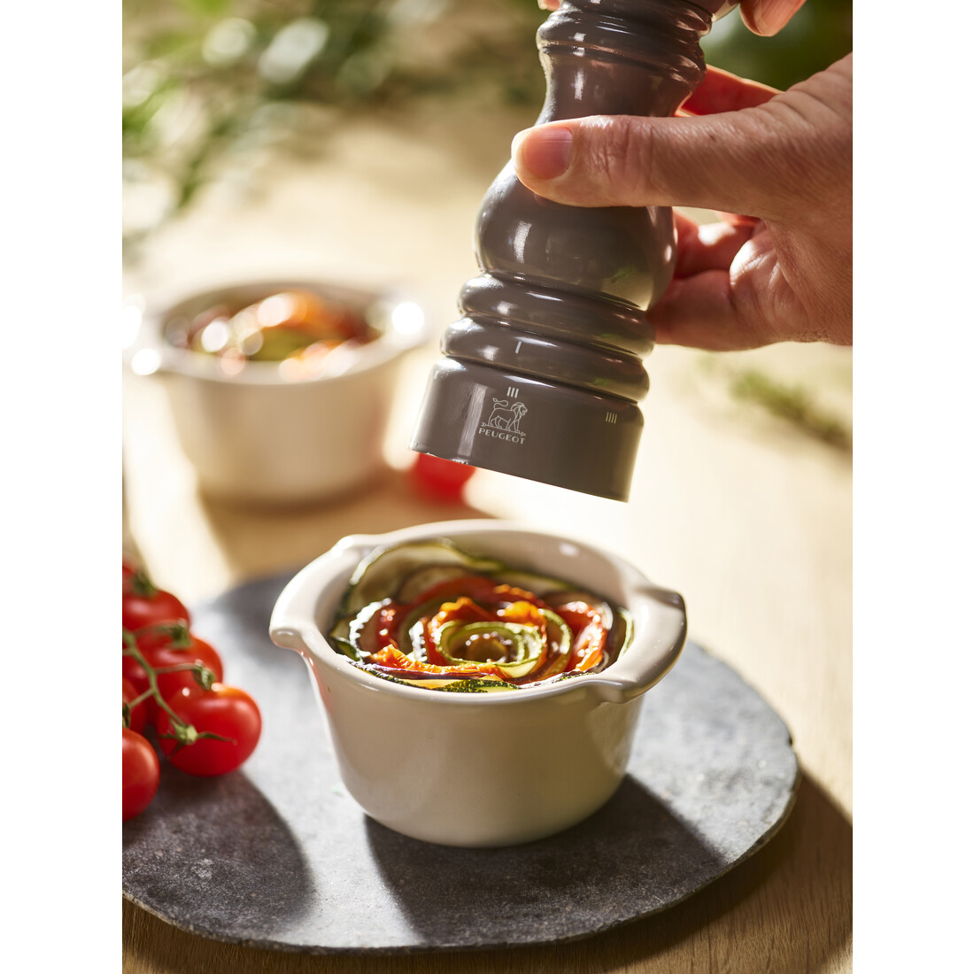 De klassieke Peugeot pepermolen, maar dan in moderne en vernieuwde kleuren. Dat is de Peugeot ParisRama serie. Deze pepermolen is 18 cm hoog en is gemaakt van PEFC hout, in de kleur leisteen. De unieke uitstraling van deze molen maakt van iedere tafel een echt feestje. Maak gerechten op smaak en stel de maalgraad gemakkelijk in, met de vernieuwde u'Select functie. Je maalt iedere peperkorrel zo fijn of grof als jij wilt. Reinig na enige tijd de pepermolen aan de binnenkant met een vochtige doek om de levensduur van deze stijlvolle molen te onderhouden.