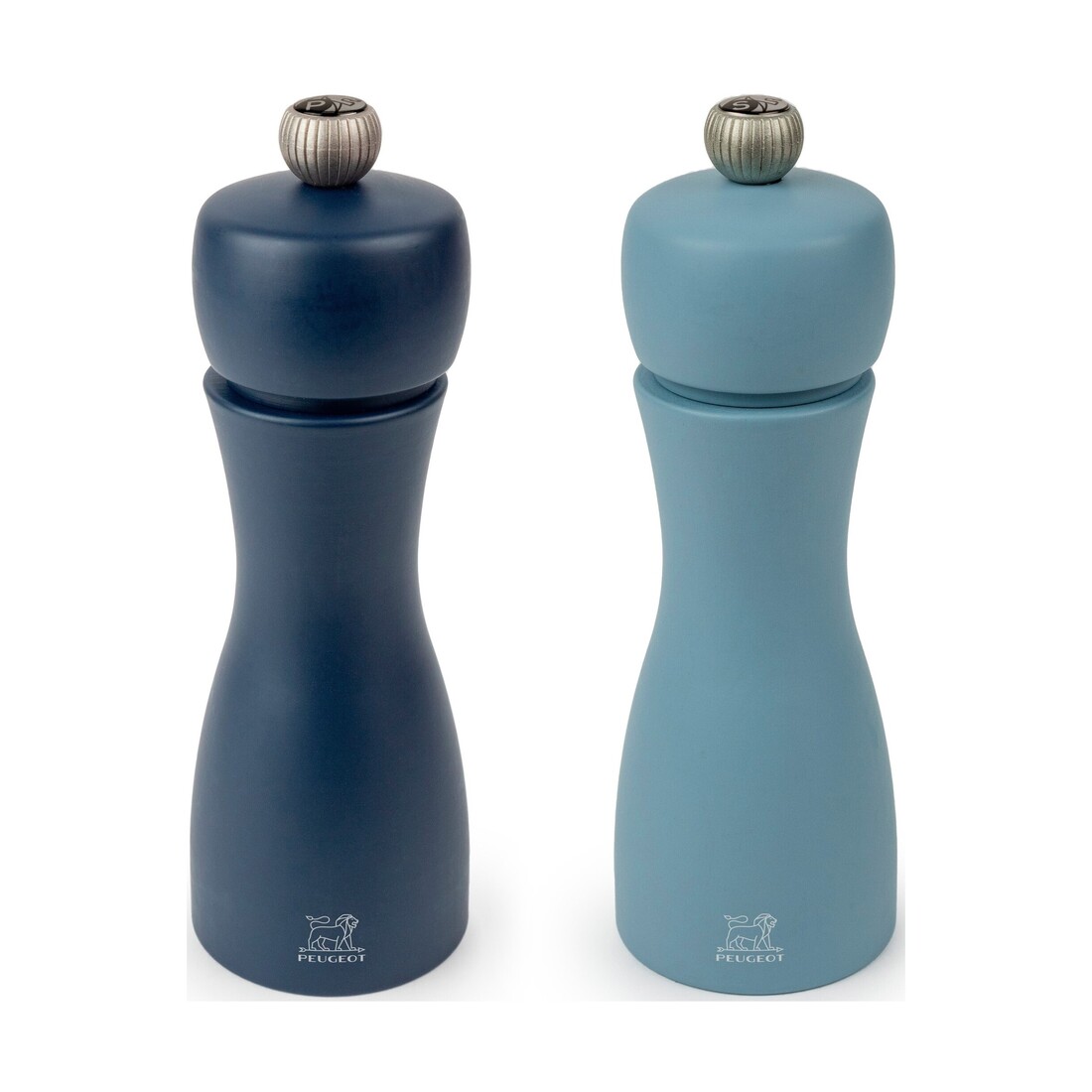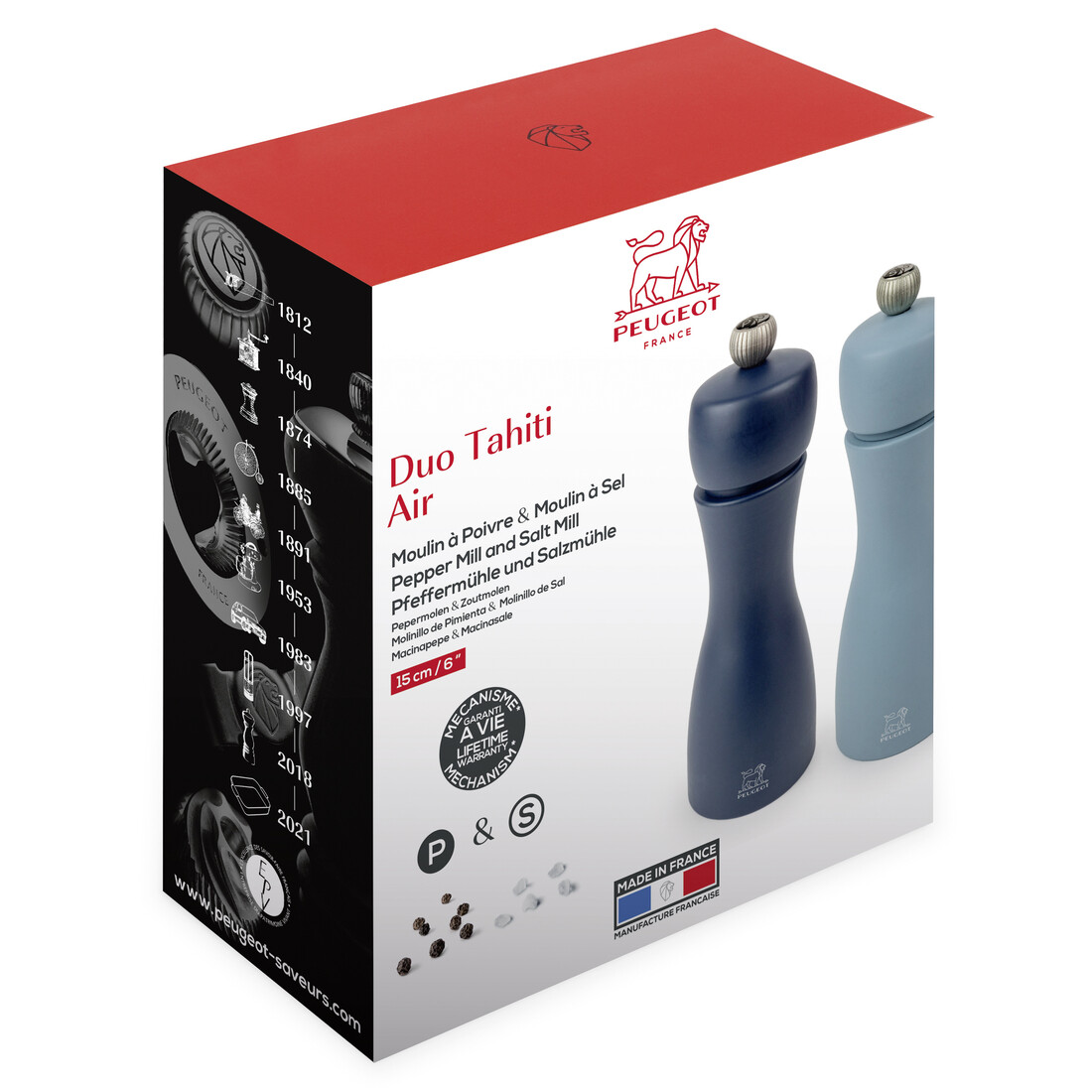 Het Peugeot Tahiti Duo wordt geïnspireerd door de 4 elementen van de natuur: Water, aarde, vuur en lucht. De peper- en zoutmolen nacht & azuur zijn gemaakt in natuurlijke blauwe tinten, gebaseerd op het element lucht. De kleuren van de molens geven een subtiele en moderne touch aan iedere keuken. Ze zijn stijlvol en compact met een afmeting van 15 cm. Heb je een gezellig etentje met vrienden of familie? Ook dan past dit Tahiti Duo perfect op tafel. De smaakmakers van iedere keuken en een onmisbare toevoeging voor iedere (hobby)kok. De zout- en pepermolen hebben verschillende kleuren, waardoor je ze gemakkelijk van elkaar kan onderscheiden. De molens worden gemaakt van duurzaam PEFC-hout en ze hebben een instelbare maalgraad. Zo stel jij zelf de perfecte maling in voor elk gerecht. Je kan de Tahiti zout- en pepermolen gelijk in gebruik nemen, omdat ze inclusief zout- en peperkorrels geleverd worden. Handig!