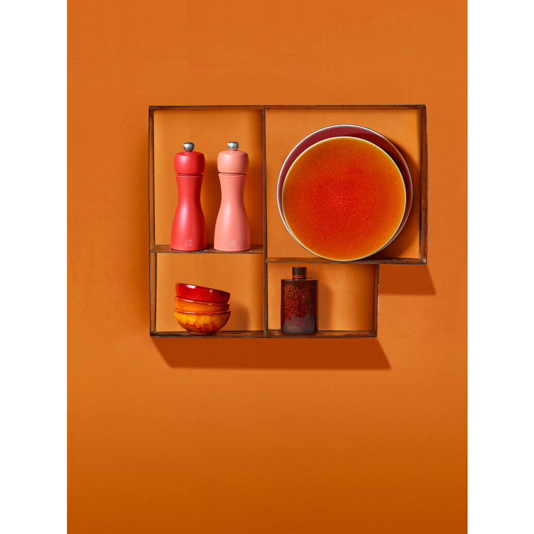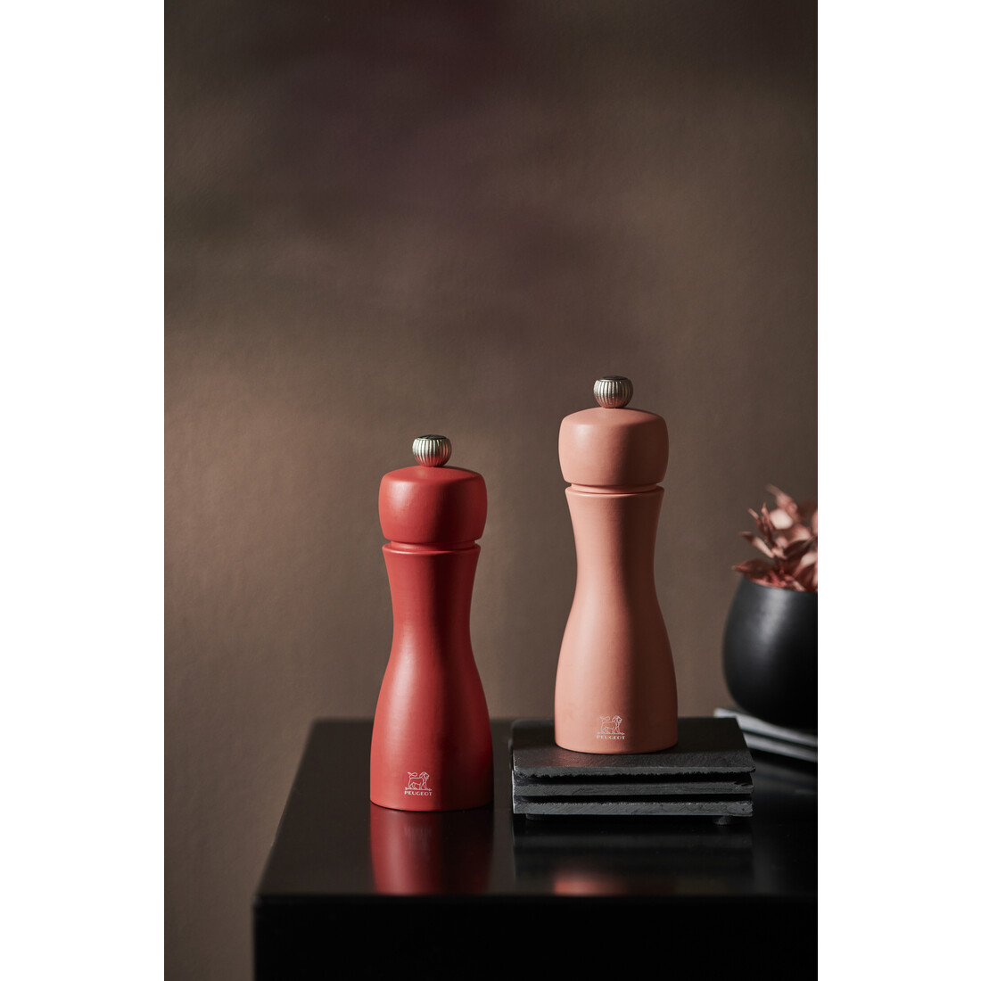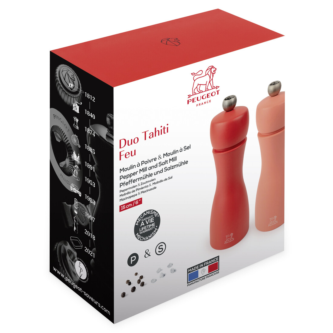 Het Peugeot Tahiti Duo wordt geïnspireerd door de 4 elementen van de natuur: Water, aarde, vuur en lucht. De peper- en zoutmolen baksteen & vlam zijn gemaakt in gave rood/oranje tinten, gebaseerd op het element vuur. De kleuren van de molens geven een subtiele en moderne touch aan iedere keuken. Ze zijn stijlvol en compact met een afmeting van 15 cm. Heb je een gezellig etentje met vrienden of familie? Ook dan past dit Tahiti Duo perfect op tafel. De smaakmakers van iedere keuken en een onmisbare toevoeging voor iedere (hobby)kok. De zout- en pepermolen hebben verschillende kleuren, waardoor je ze gemakkelijk van elkaar kan onderscheiden. De molens worden gemaakt van duurzaam PEFC-hout en ze hebben een instelbare maalgraad. Zo stel jij zelf de perfecte maling in voor elk gerecht. Je kan de Tahiti zout- en pepermolen gelijk in gebruik nemen, omdat ze inclusief zout- en peperkorrels geleverd worden. Handig!