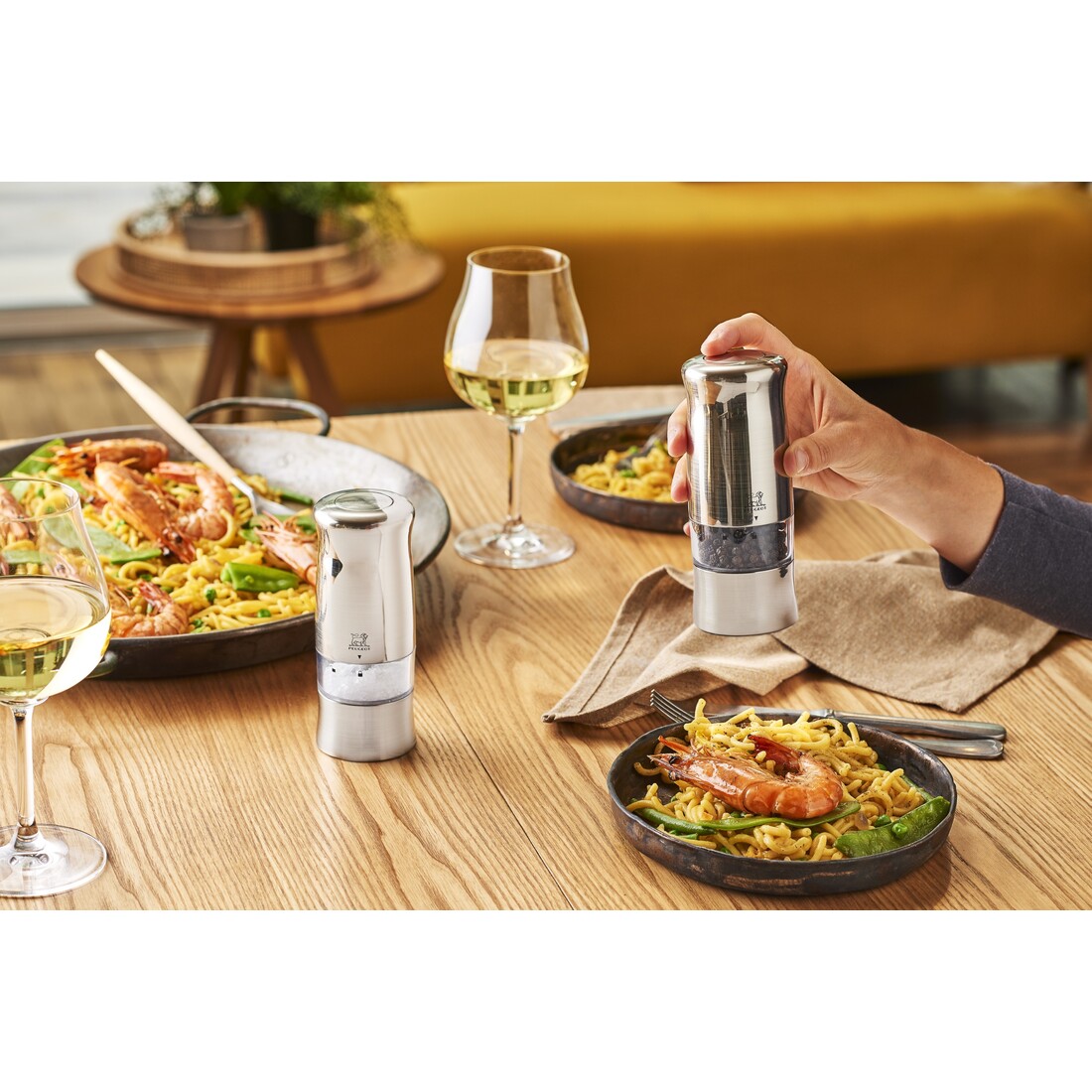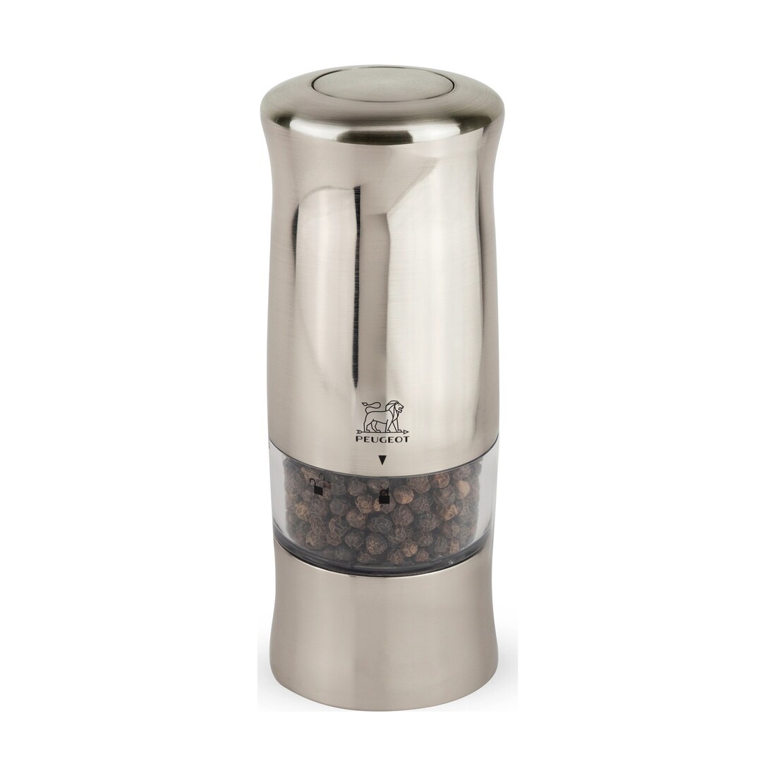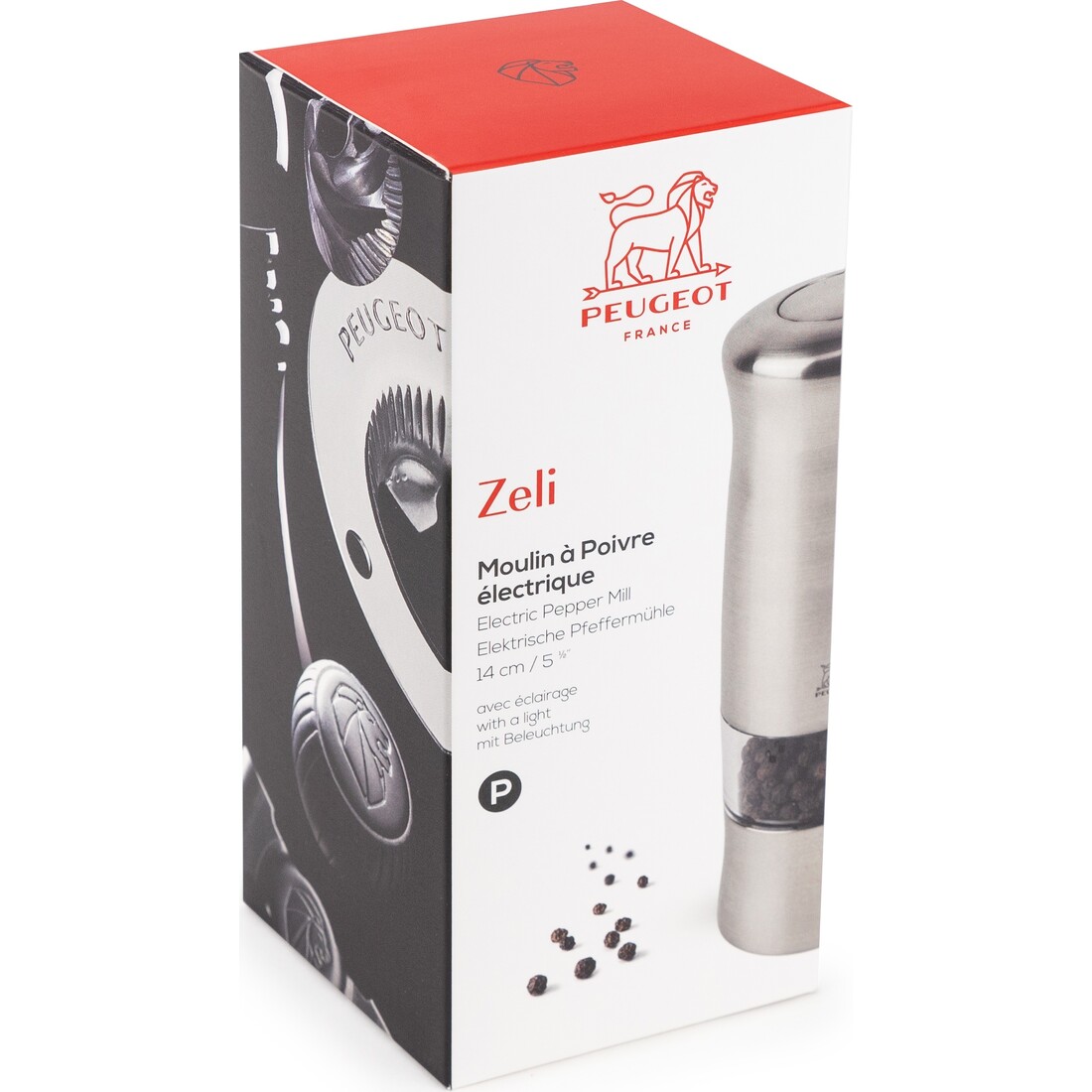 De elektrische Zeli pepermolen 14 cm met geborstelde metalen coating is praktisch en efficiënt. De compacte molen ligt perfect in de hand. Met één druk op de knop maal je de gewenste hoeveelheid peper. De molen is voorzien van een handig lampje en werkt op batterijen.