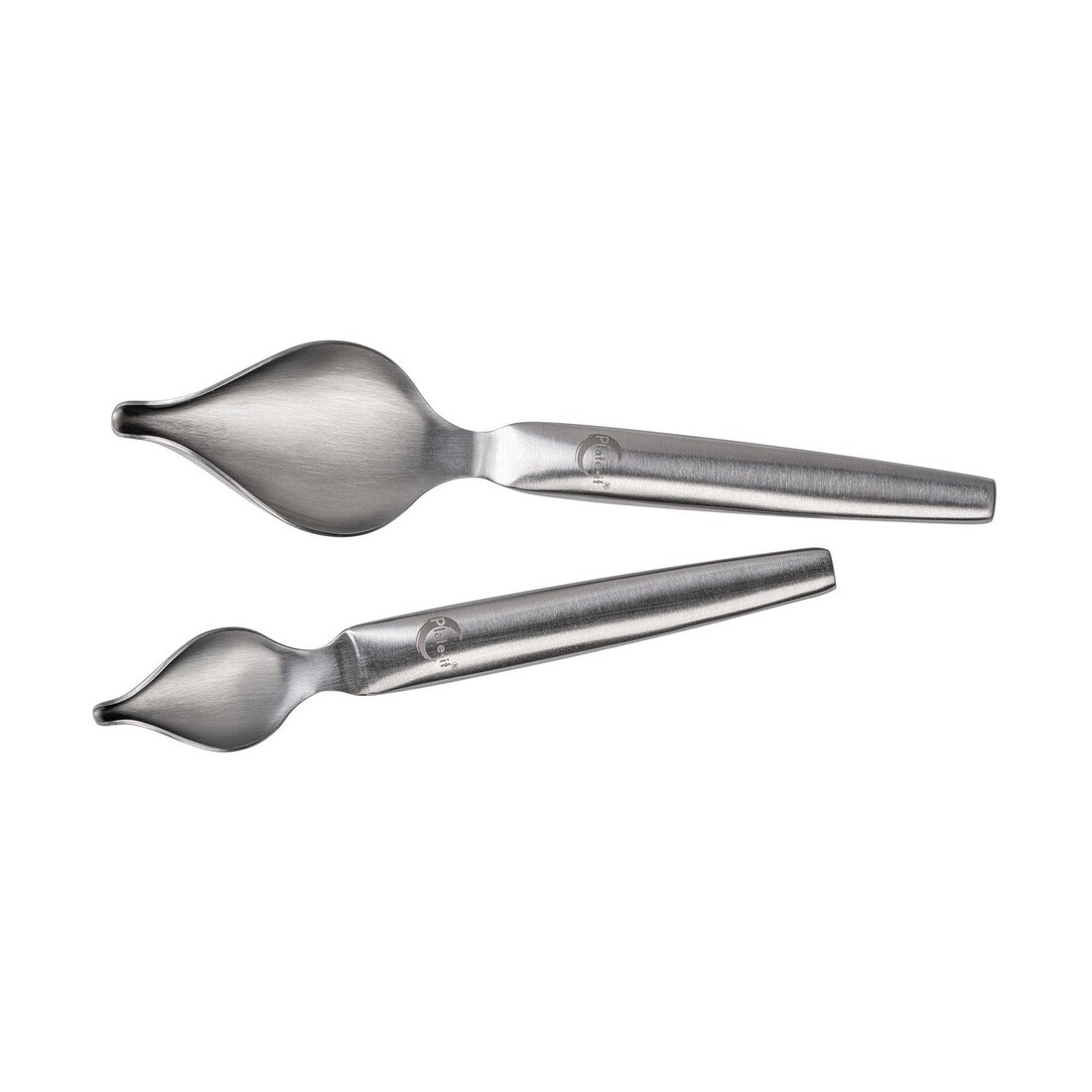 De decoratielepels van Plate-it zijn ideaal voor het decoreren van gerechten, taarten en meer. Maak indrukwekkende vormen, creëer met gemak prachtige spiralen en geef het bord sierlijke lijnen van saus of jus. Met de 2-delige set speel je gemakkelijk met dunne en dikke lijnen om zo een culinaire creatie neer te zetten op ieder bord. Je geeft ieder gerecht net dat beetje extra aandacht en maakt indruk op je gasten met deze decoratielepels. De decoratielepels worden als 2-delige set geleverd, met een grotere en kleine lepel. Ze zijn gemaakt van roestvrij staal en hebben een matte afwerkingen. De lepels lopen af in een soort punt, waarmee je sauzen of jus gemakkelijk uitschenkt en doseert. Probeer het zelf en Plate-it like a pro!