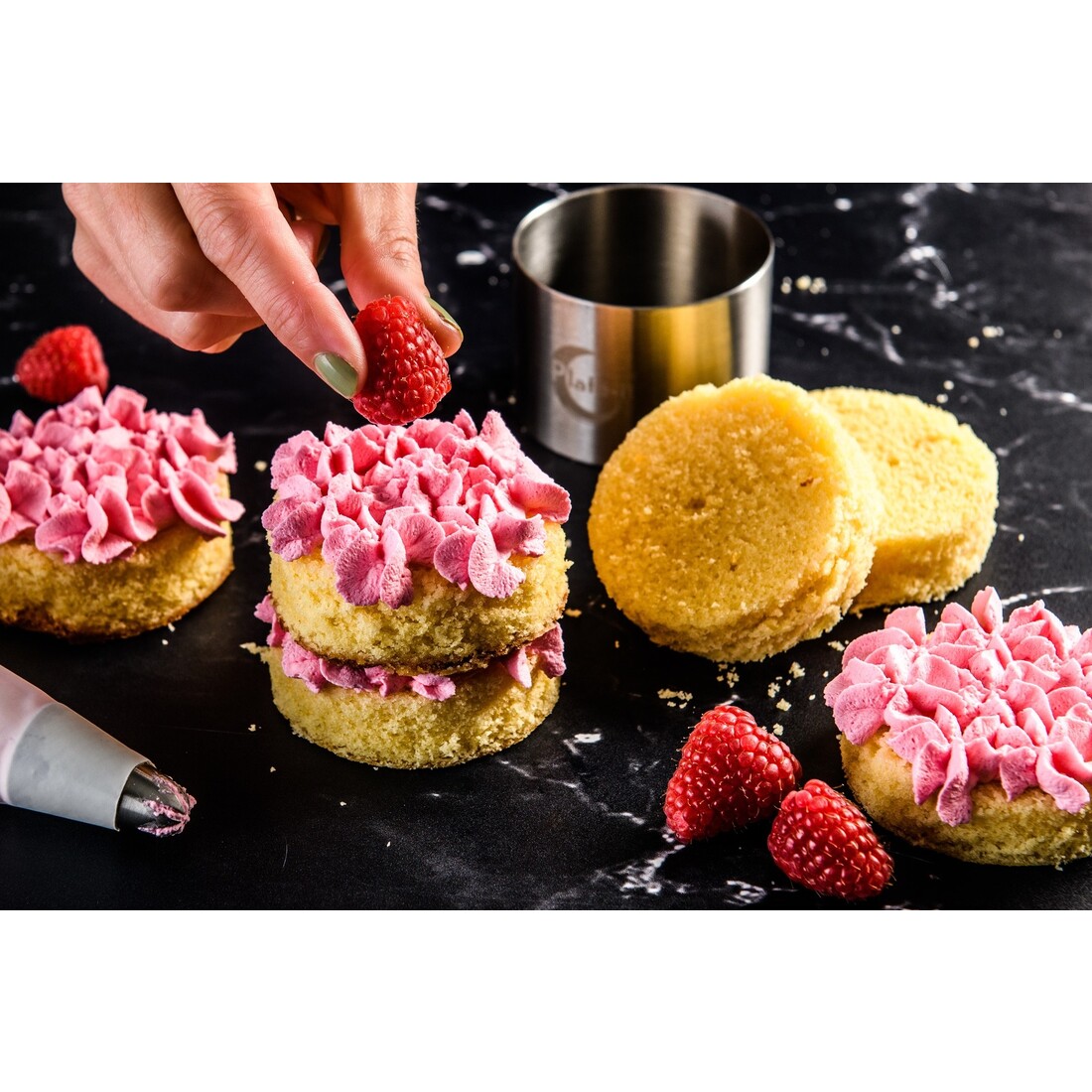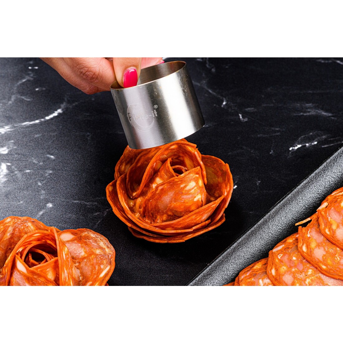 Een steak tartaar, smeuïge risotto of dikkere puree geef je prachtig vorm op je bord met de garneerringen van Plate-it. Vul één van de drie ringen uit de set en stamp deze aan met de meegeleverde 'pusher'. De 4-delige set zorgt voor een strakke opmaak op ieder bord. Je brengt de presentatie van jouw gerecht naar een hoger niveau. Met de pusher kan je in combinatie met kleine druppels saus ook prachtige patronen maken. De uiststekers en de pusher zijn gemaakt van stevig roestvrij staal met een matte afwerking. Decoreer ieder bord met de garneerringen van dit merk. Plate-it like a pro!