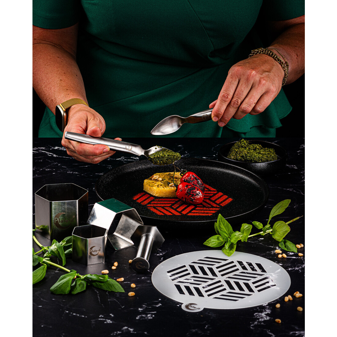 Een steak tartaar, smeuïge risotto of dikkere puree geef je prachtig vorm op je bord met de garneerringen van Plate-it. Deze unieke garneerringen zijn niet rond, maar hebben een hexagonvorm. De 4-delige set zorgt voor een strakke opmaak op ieder bord. Je brengt de presentatie van jouw gerecht naar een hoger niveau. Vul één van de drie ringen uit de set en stamp deze aan met de meegeleverde 'pusher'. Met de pusher kan je in combinatie met kleine druppels saus ook prachtige patronen maken. Met de ringen kan je ook cake of andere ingrediënten in hexagonvorm uitsteken. De uitstekers en de pusher zijn gemaakt van stevig roestvrij staal met een matte afwerking. Decoreer ieder bord met de garneerringen van dit merk. Plate-it like a pro!