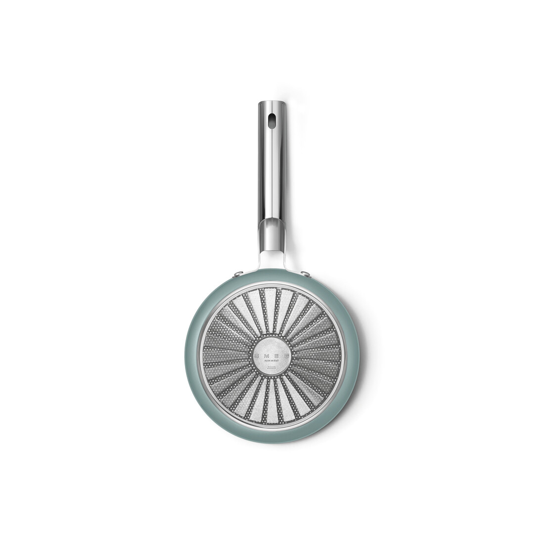 De sauspan is gemaakt in Italië en heeft een roestvrijstalen bodemplaat die zorgt voor een gelijkmatige warmteverdeling. De pan is verkrijgbaar in drie verschillende kleuren: crème, mat zwart en emerald green.