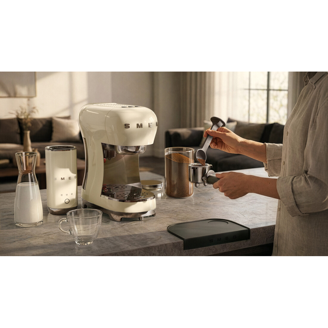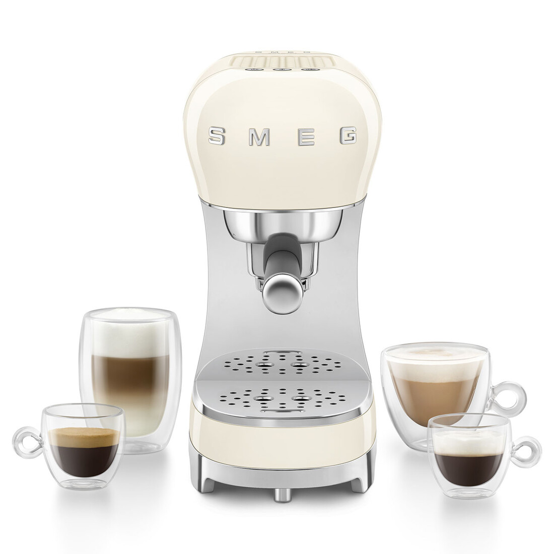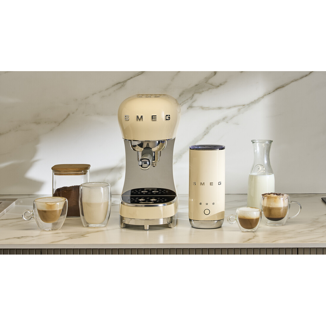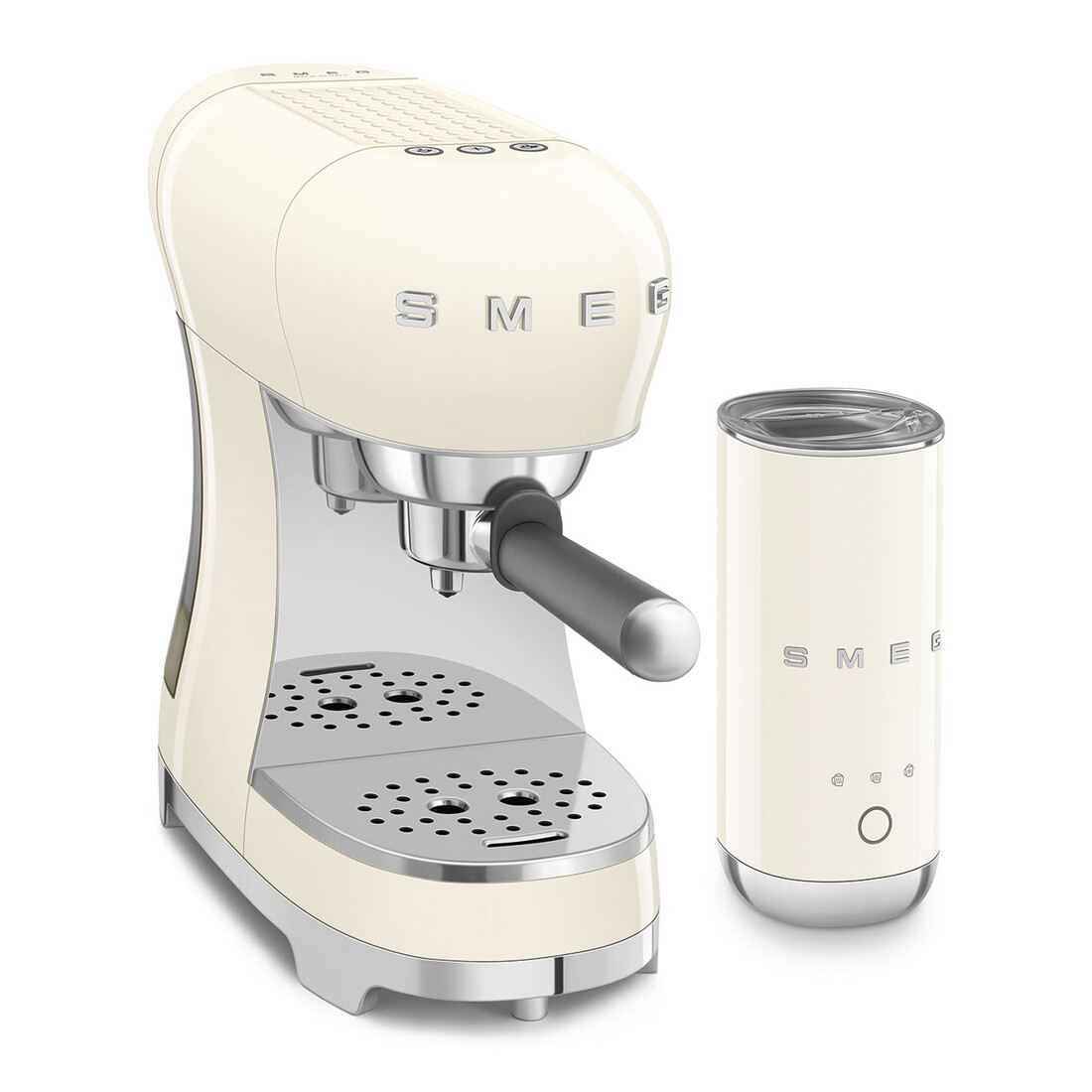 Deze Smeg set combineert een handmatige espressomachine met een losse melkopschuimer, uitgevoerd in het herkenbare jaren 50 retrodesign. De afgeronde vormen en glanzende afwerking geven beide apparaten een opvallende, maar tijdloze uitstraling op het aanrecht.