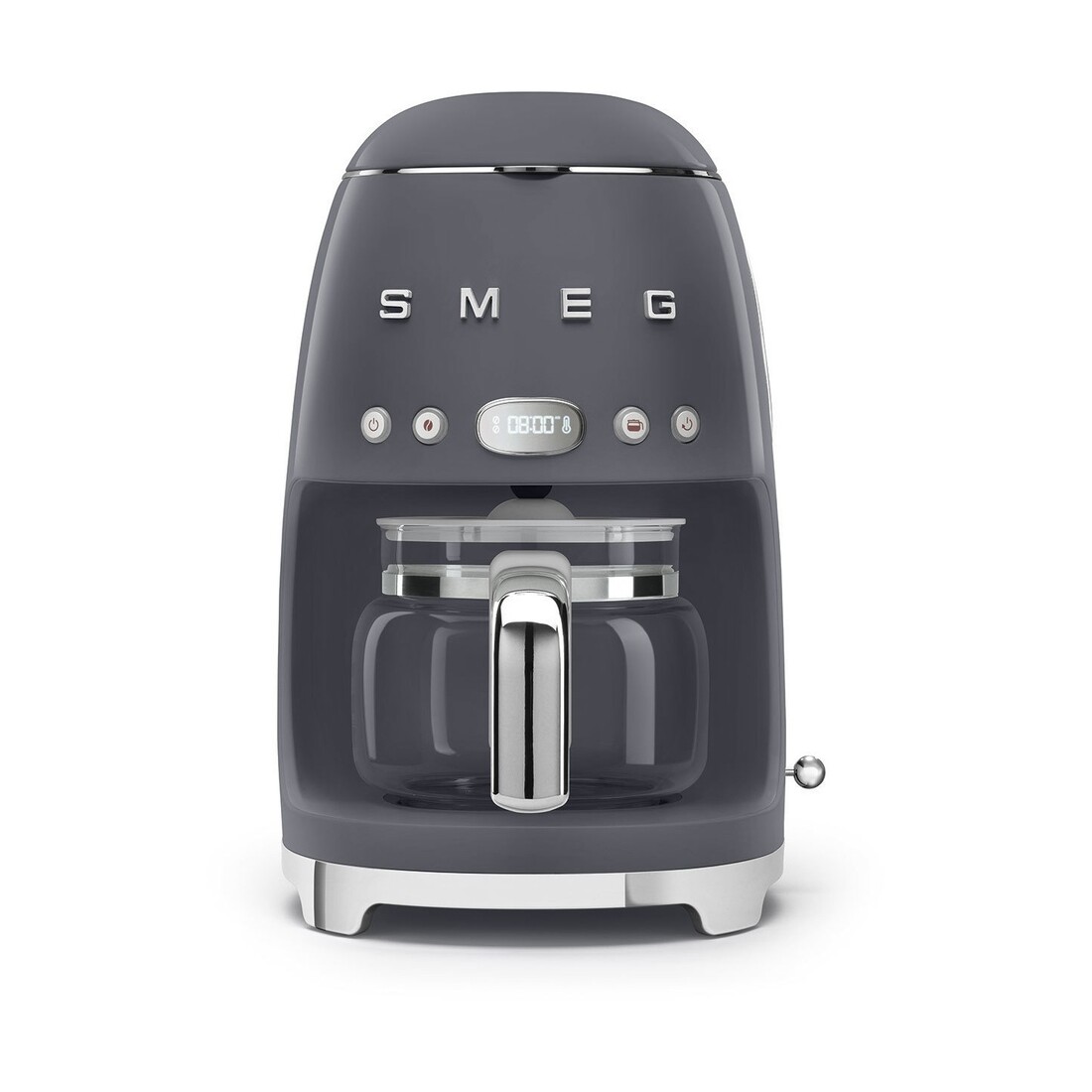 Het koffiezetapparaat DCF02 van SMEG is voor de lekkerste filterkoffie. Je zet tot 10 koppen koffie in de glazen koffiekan met een inhoud van 1,25 liter. De rest van het apparaat is gemaakt van kunststof en metaal en verkrijgbaar in verschillende moderne kleuren. Deze variant is bijvoorbeeld leigrijs van kleur.