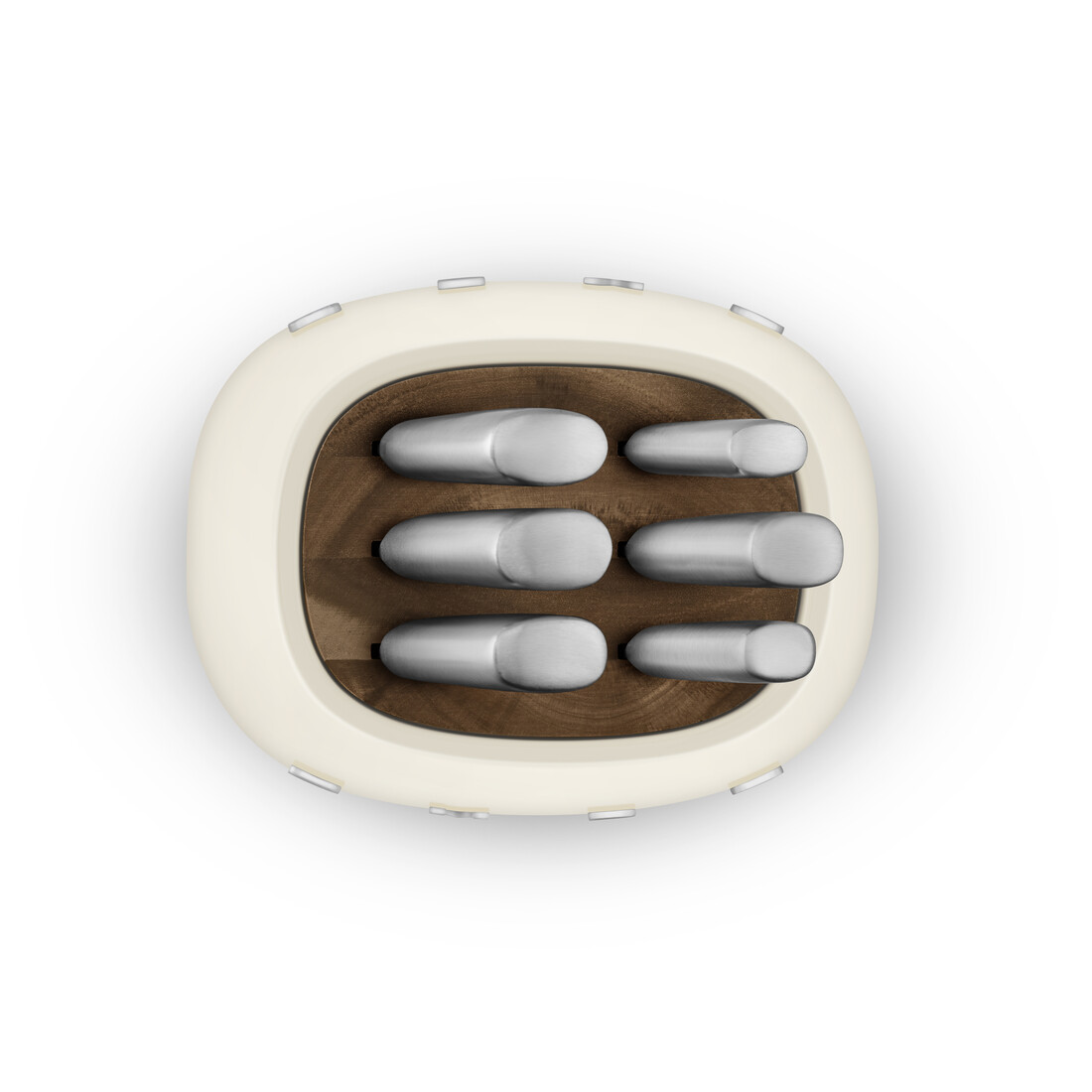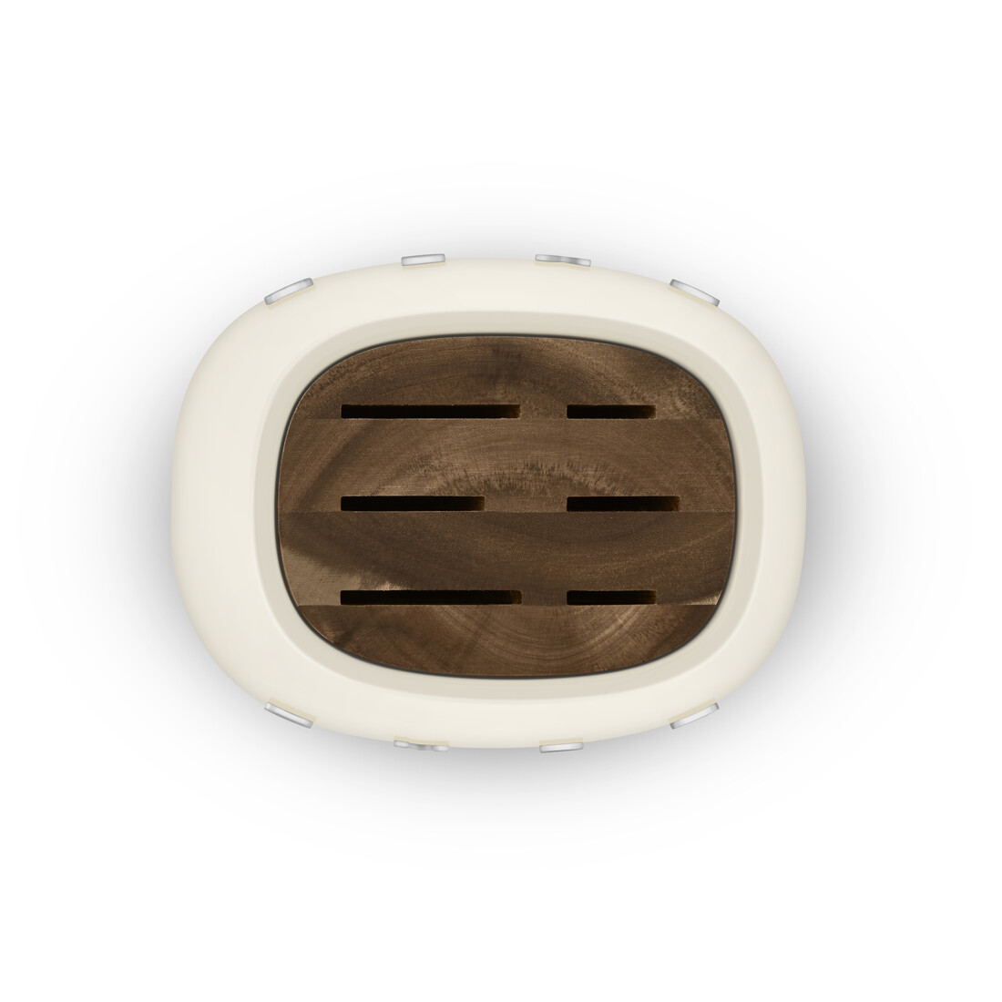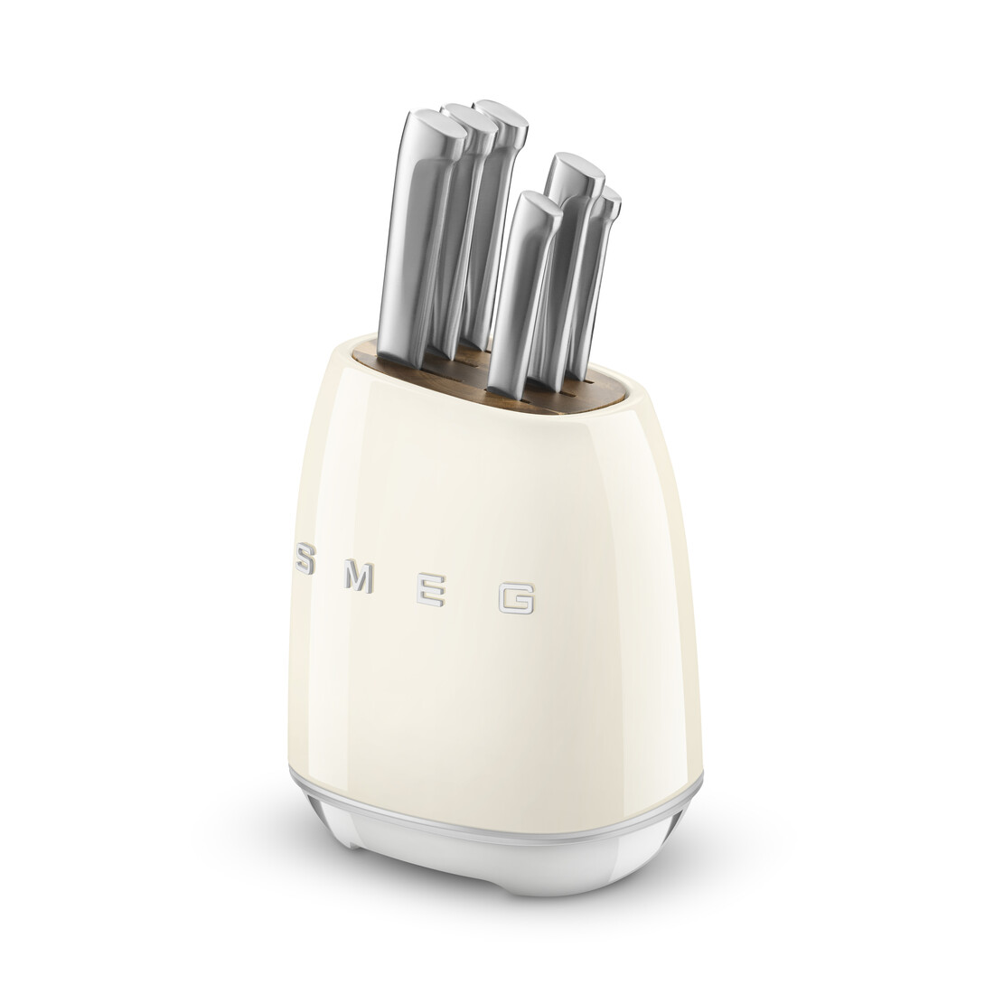 Het SMEG messenblok KBSF02CR in crème is een hoogwaardige en stijlvolle toevoeging aan elke keuken. Het blok bevat zes professionele messen, elk vervaardigd uit duurzaam roestvrij staal. Het opvallende retro ontwerp is zowel modern als tijdloos en biedt een georganiseerde en veilige opslag voor je messen, waardoor je aanrecht netjes en geordend blijft.