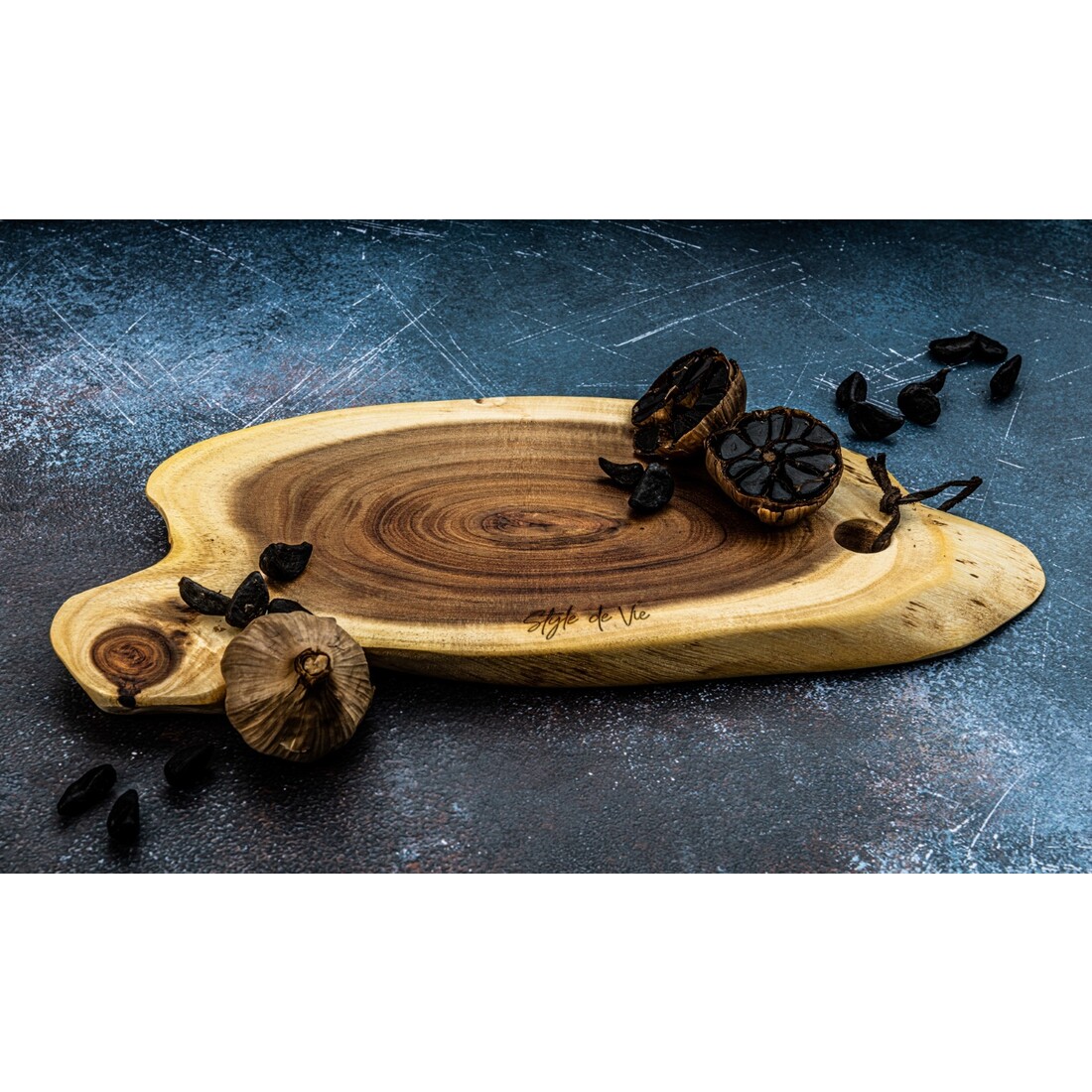 Deze prachtige snij-/serveerplanken van Style de Vie zijn geheel gemaakt uit één stuk hout. De planken zijn licht van gewicht en makkelijk te hanteren. Elke plank is al behandeld met een natuurlijke olie en is direct klaar voor gebruik. Niet vaatwasmachine bestendig.
