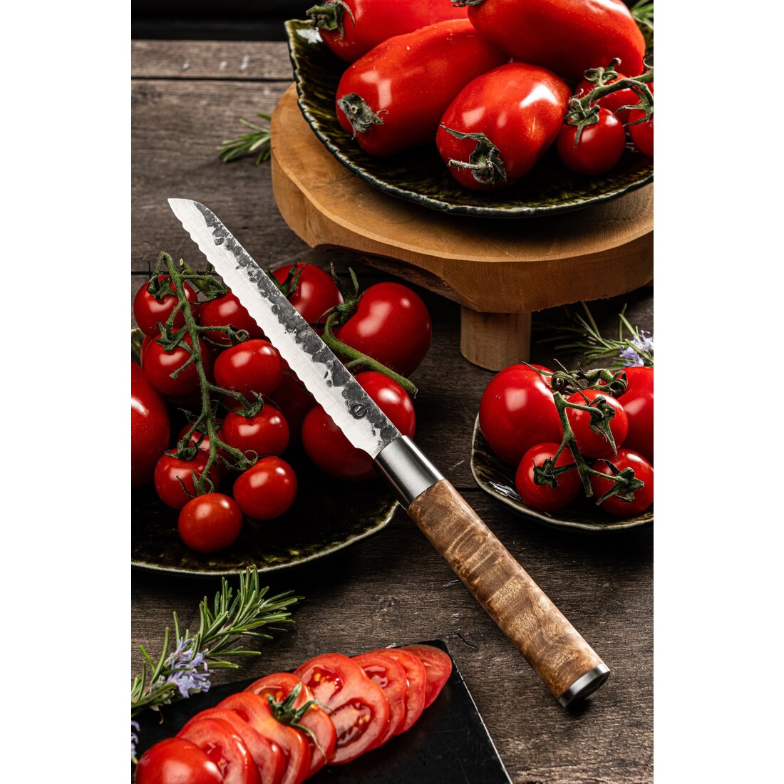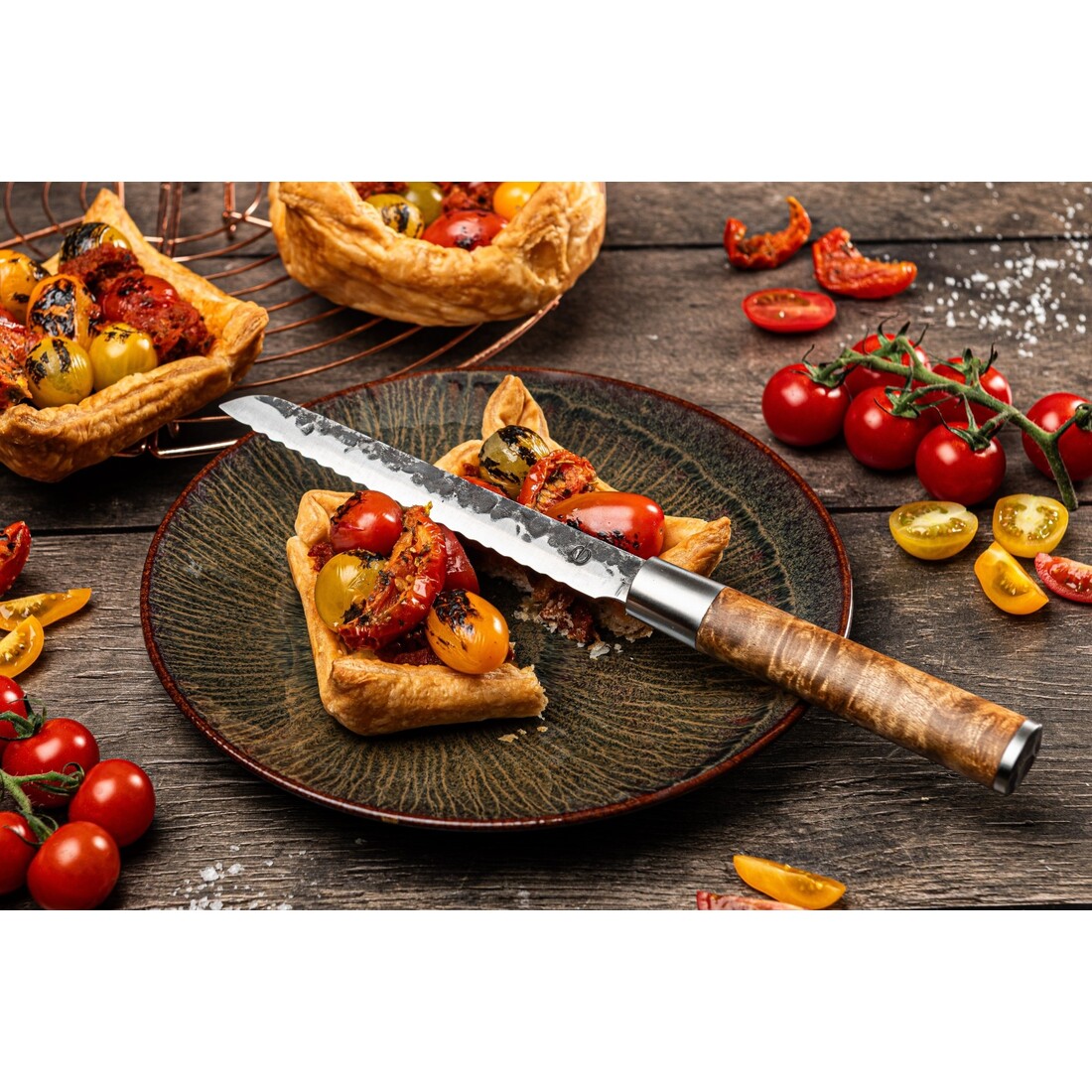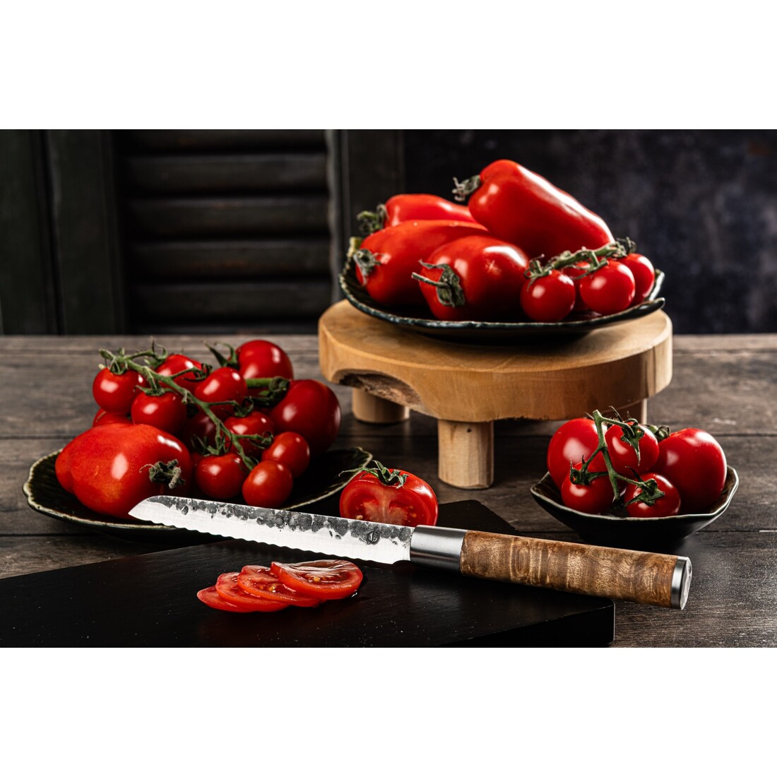 Het lemmet is gesmeed uit hoogwaardig Japans VG10-staal met een Rockwell hardheid van 60. Dit premium staal staat bekend om zijn langdurige scherpte, taaiheid en perfecte balans, zelfs bij intensief gebruik. Het handvat is vervaardigd uit karaktervol wortelhout, wat niet alleen ergonomisch en comfortabel in de hand ligt, maar ook een unieke en natuurlijke uitstraling geeft. In combinatie met het gehamerde lemmet ontstaat een robuuste en ambachtelijke look die elke uitvoering bijzonder maakt.