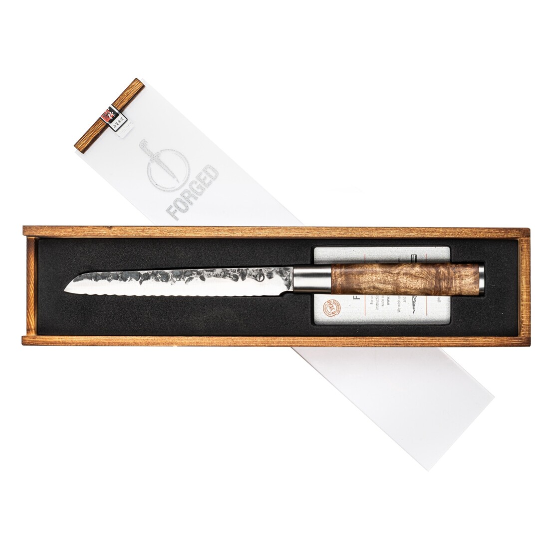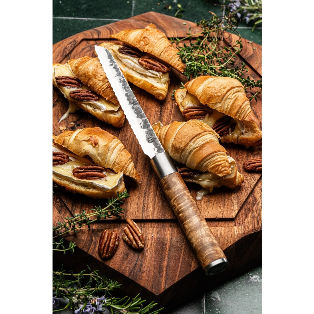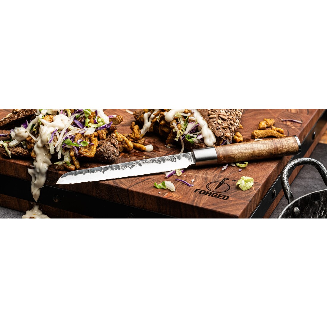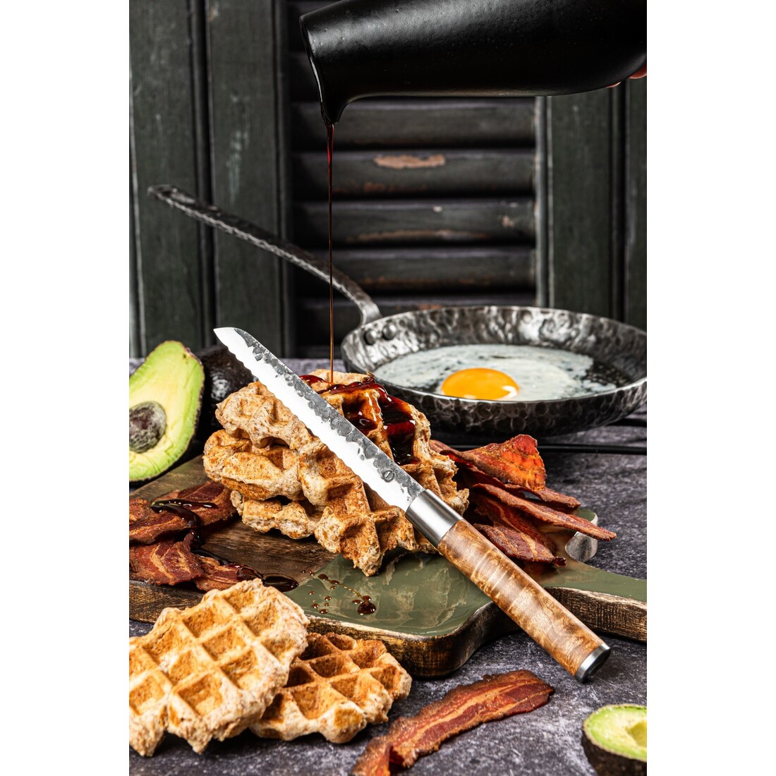Het lemmet is gesmeed uit hoogwaardig Japans VG10-staal met een Rockwell hardheid van 60. Dit premium staal staat bekend om zijn langdurige scherpte, taaiheid en perfecte balans, zelfs bij intensief gebruik. Het handvat is vervaardigd uit karaktervol wortelhout, wat niet alleen ergonomisch en comfortabel in de hand ligt, maar ook een unieke en natuurlijke uitstraling geeft. In combinatie met het gehamerde lemmet ontstaat een robuuste en ambachtelijke look die elke uitvoering bijzonder maakt.