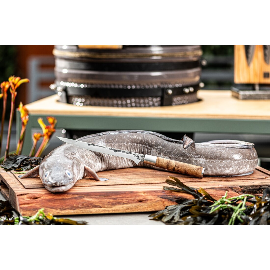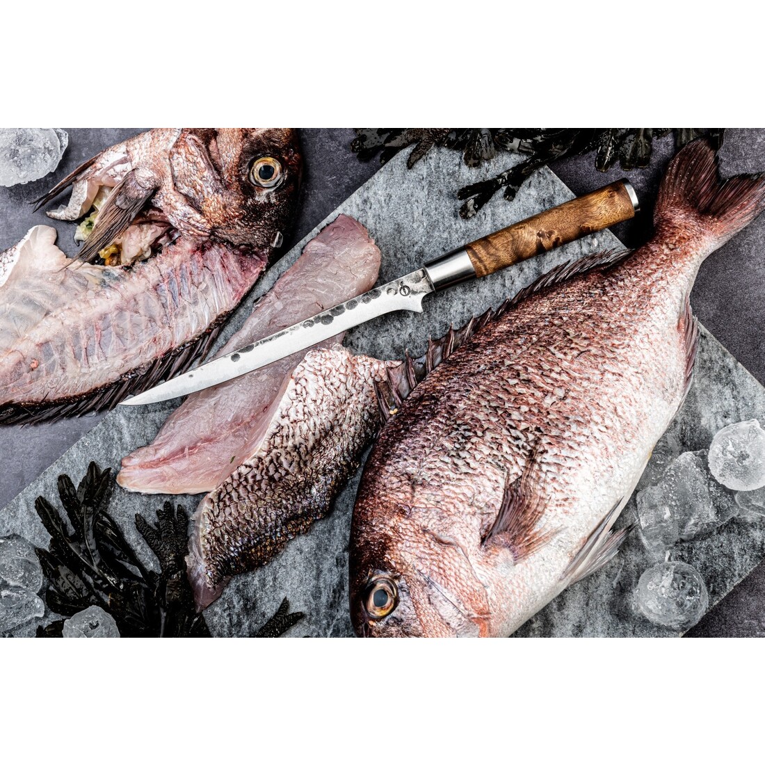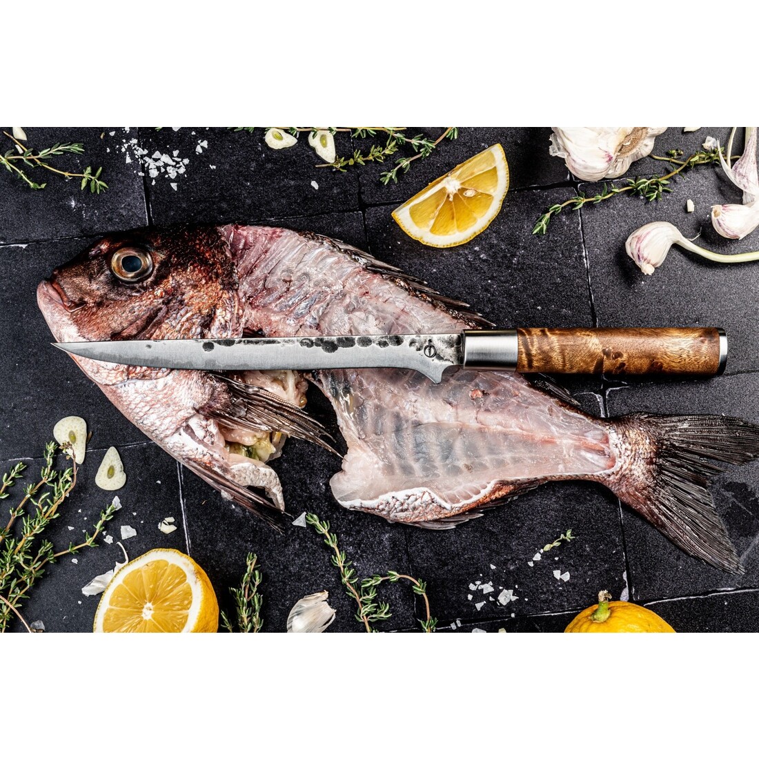 Voel je als een vis in het water – maar dan in je eigen keuken – met het Forged VG10 visfileermes. Dit mes is speciaal ontwikkeld voor het verfijnde werk van het fileren van vis. Het dunne, flexibele lemmet van 18 cm volgt moeiteloos de graat, zodat je met volledige controle prachtige filets kunt snijden, zonder graatjes of onnodig verlies van vlees. Het lemmet is vervaardigd uit hoogwaardig VG10 staal met een hardheid van 59 Rockwell. Dit staal staat bekend om zijn ongeëvenaarde scherpte, flexibiliteit en langdurige duurzaamheid. Zo snijd je met gemak door zelfs de meest delicate vissoorten, keer op keer, zonder dat het mes snel bot wordt. Het handvat is gemaakt van luxueus wortelhout, dat niet alleen zorgt voor een natuurlijke en stijlvolle uitstraling, maar ook een comfortabele en stevige grip biedt. De combinatie van vakmanschap, scherpte en snijcomfort maakt dit fileermes een onmisbare tool voor elke visliefhebber en kookfanaat. Het Forged VG10 visfileermes is de perfecte keuze voor wie houdt van koken met precisie, passie en oog voor detail.