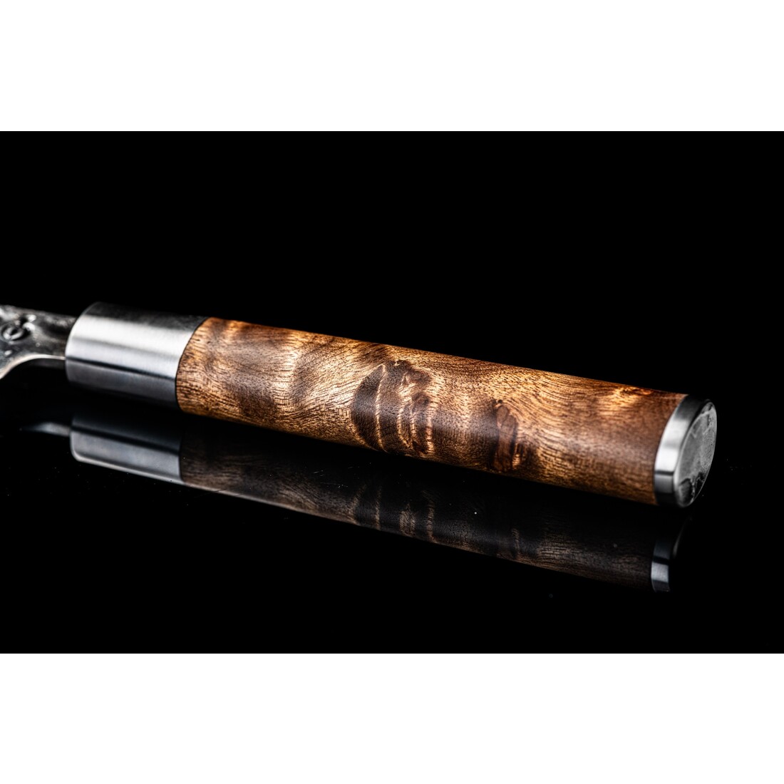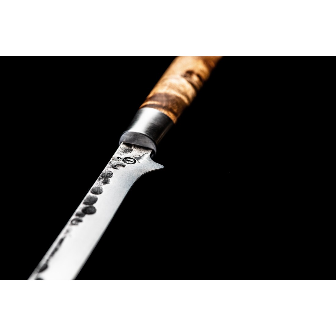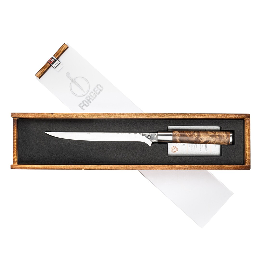 Voel je als een vis in het water – maar dan in je eigen keuken – met het Forged VG10 visfileermes. Dit mes is speciaal ontwikkeld voor het verfijnde werk van het fileren van vis. Het dunne, flexibele lemmet van 18 cm volgt moeiteloos de graat, zodat je met volledige controle prachtige filets kunt snijden, zonder graatjes of onnodig verlies van vlees. Het lemmet is vervaardigd uit hoogwaardig VG10 staal met een hardheid van 59 Rockwell. Dit staal staat bekend om zijn ongeëvenaarde scherpte, flexibiliteit en langdurige duurzaamheid. Zo snijd je met gemak door zelfs de meest delicate vissoorten, keer op keer, zonder dat het mes snel bot wordt. Het handvat is gemaakt van luxueus wortelhout, dat niet alleen zorgt voor een natuurlijke en stijlvolle uitstraling, maar ook een comfortabele en stevige grip biedt. De combinatie van vakmanschap, scherpte en snijcomfort maakt dit fileermes een onmisbare tool voor elke visliefhebber en kookfanaat. Het Forged VG10 visfileermes is de perfecte keuze voor wie houdt van koken met precisie, passie en oog voor detail.